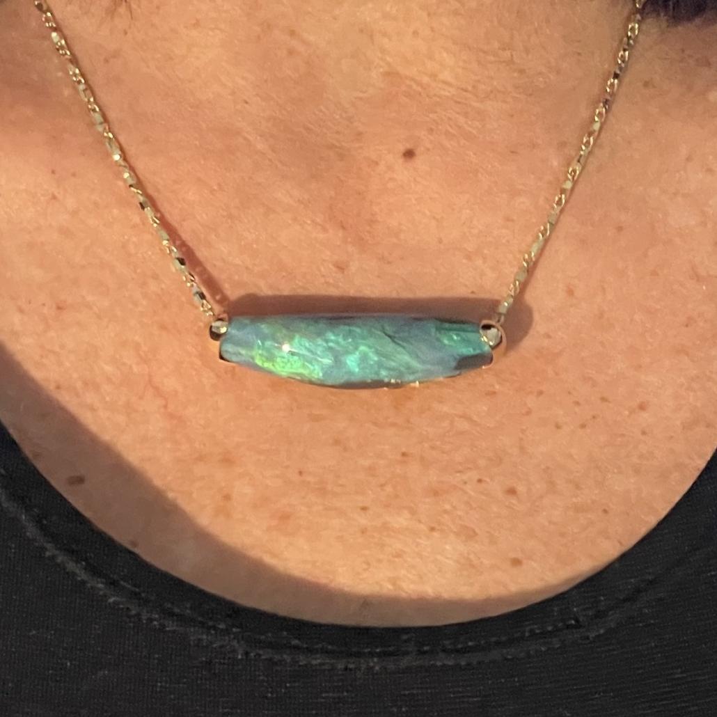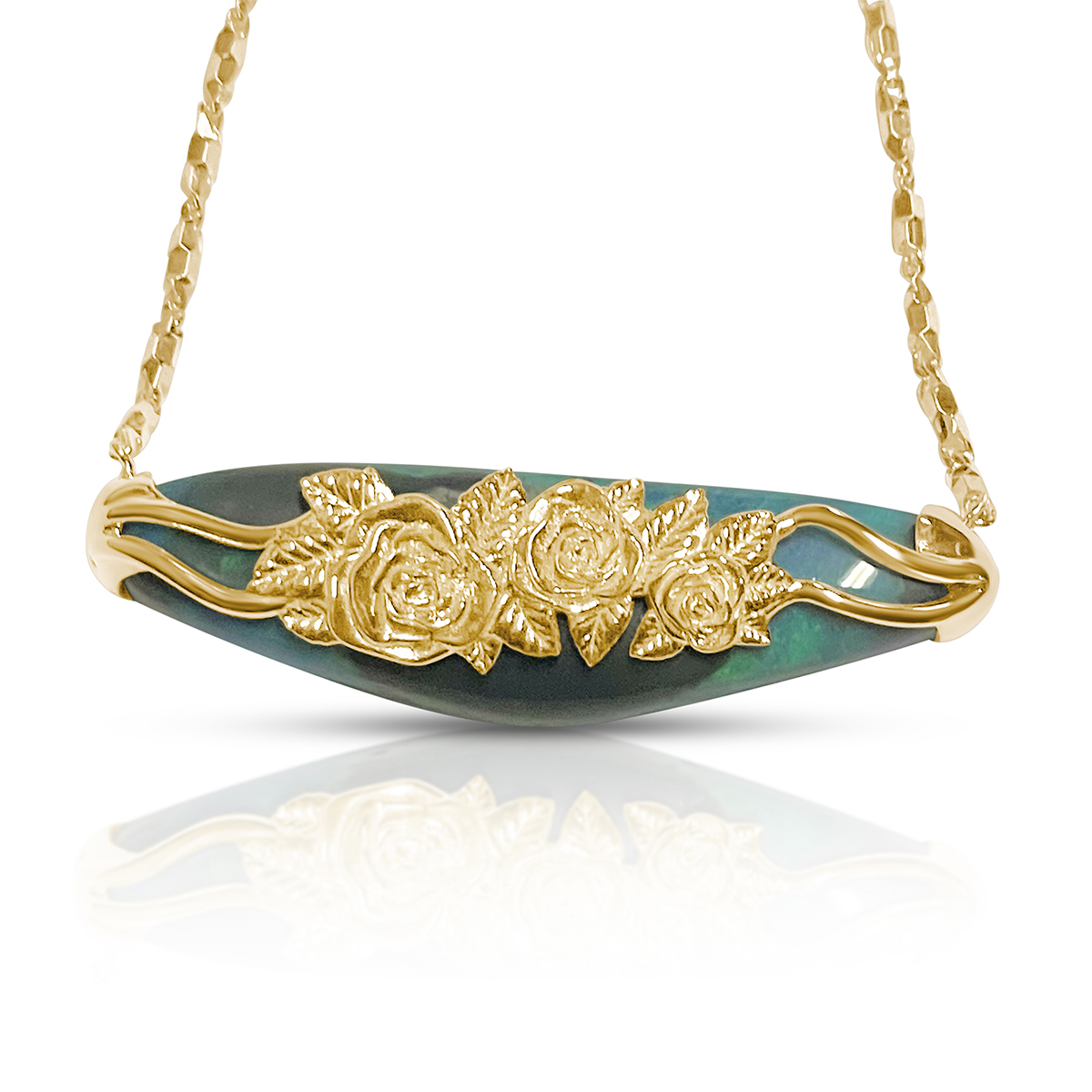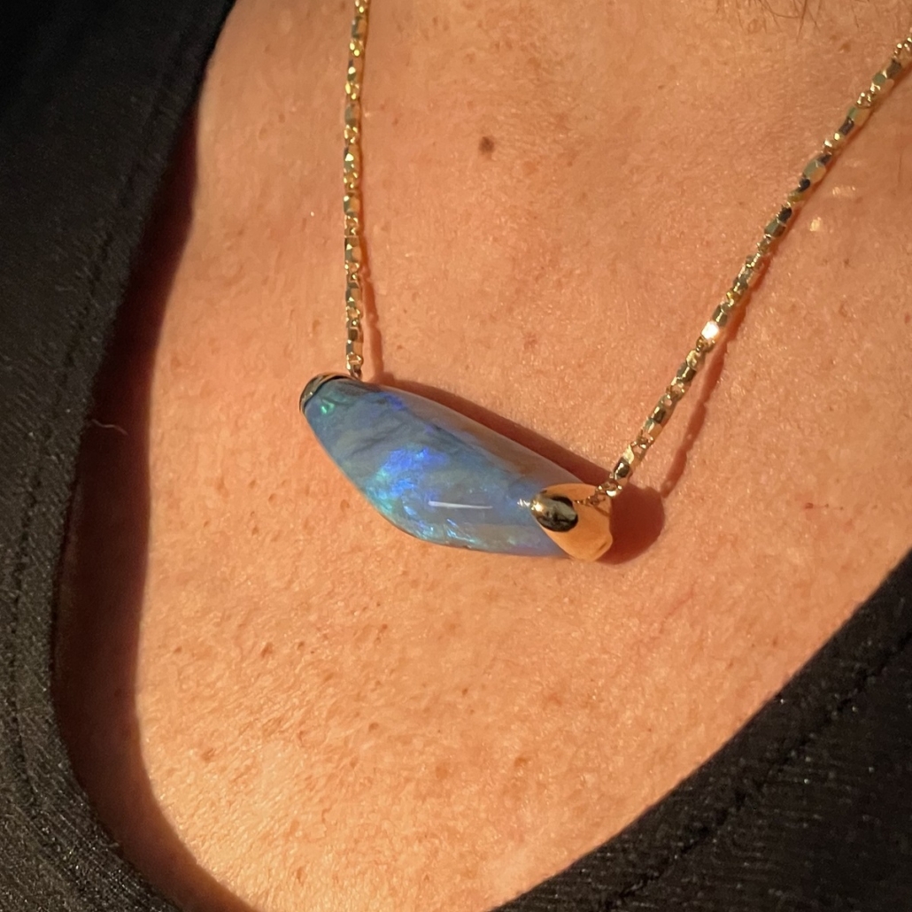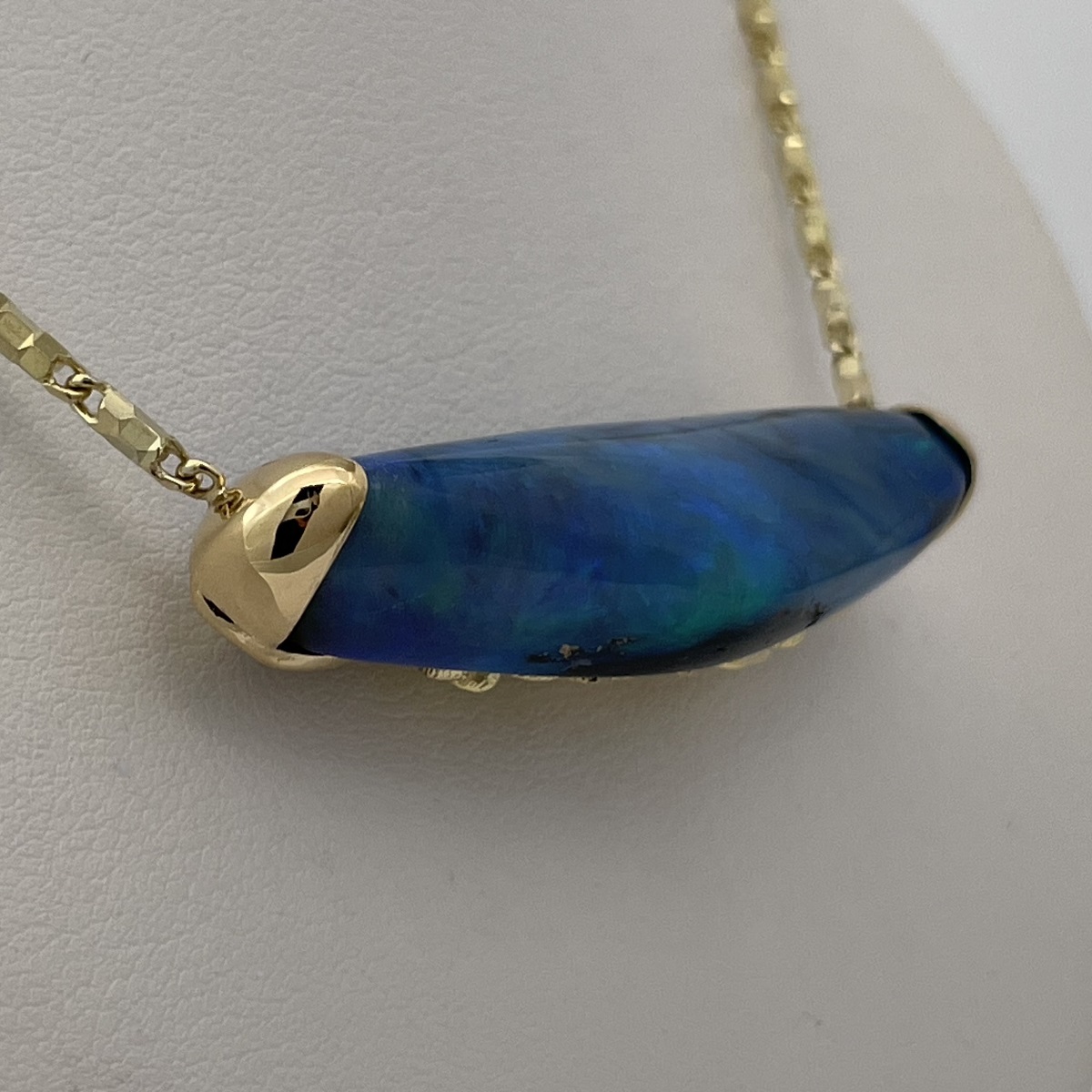 Tags 18k Yellow, Abstract, Australian, Bezel Set, Black Opal, Desire, Elegant, Fancy Color, Floral, Handcrafted, link chain, Multi-Color, Necklace, One-Of-A-Kind, Opal, solitaire