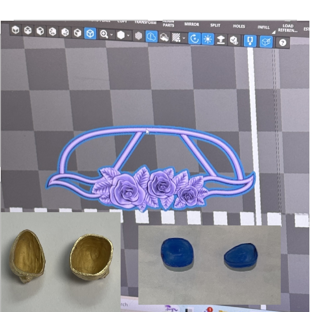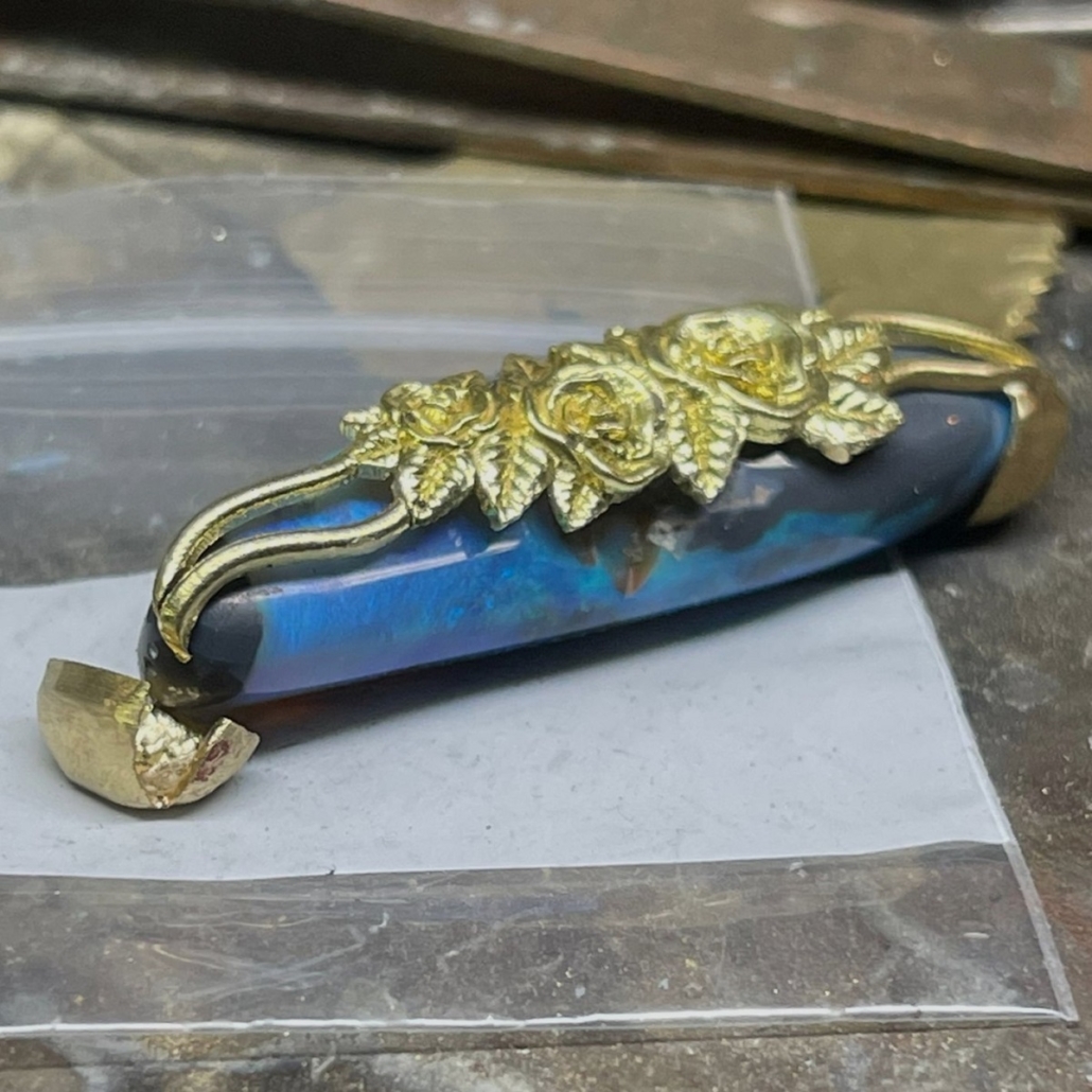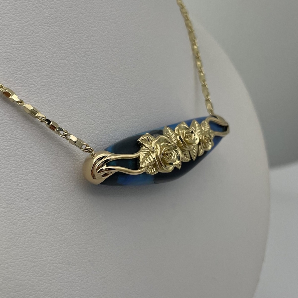 Hand-carved and set in a custom 18k gold mounting, one side is elegantly minimalist, while the reverse bursts into full bloom with golden roses and leaves lovingly crafted by hand.