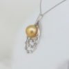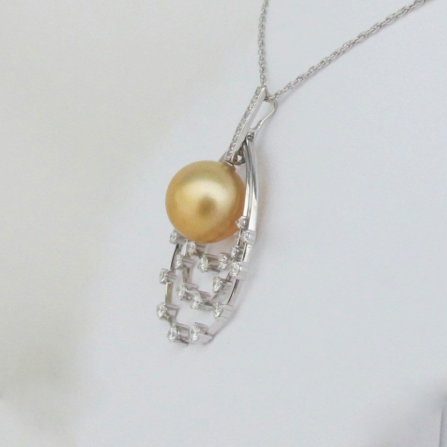 This pendant is 14k white gold and weighs 6 grams. It contains one 14mm round golden pearl and 31 round brilliant natural diamonds totaling 1.32cts. The diamonds are G color and VS-SI1 clarity. They graduate in size from 1.3-3.1mm. The pearl is set on a movable post and is inside three graduated pear shaped wires. The stones are arranged symmetrically and set in three prongs set on the wires. The gold wires move forward and backward.