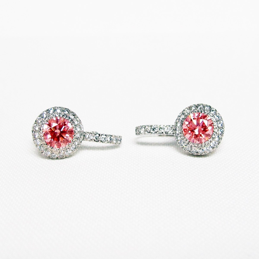These earrings are crafted in 14k white gold, featuring two natural round brilliant pink diamonds, each surrounded by a halo of smaller natural mined round brilliant diamonds in pavé settings.