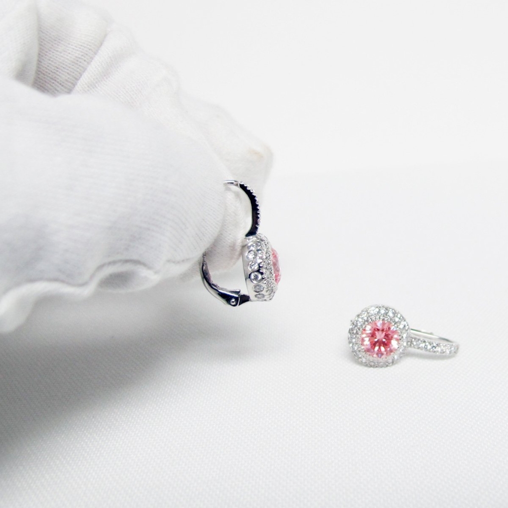 Tags 14k White, Desire, Diamond, drop, Earring, Halo, Lever Back, Pink