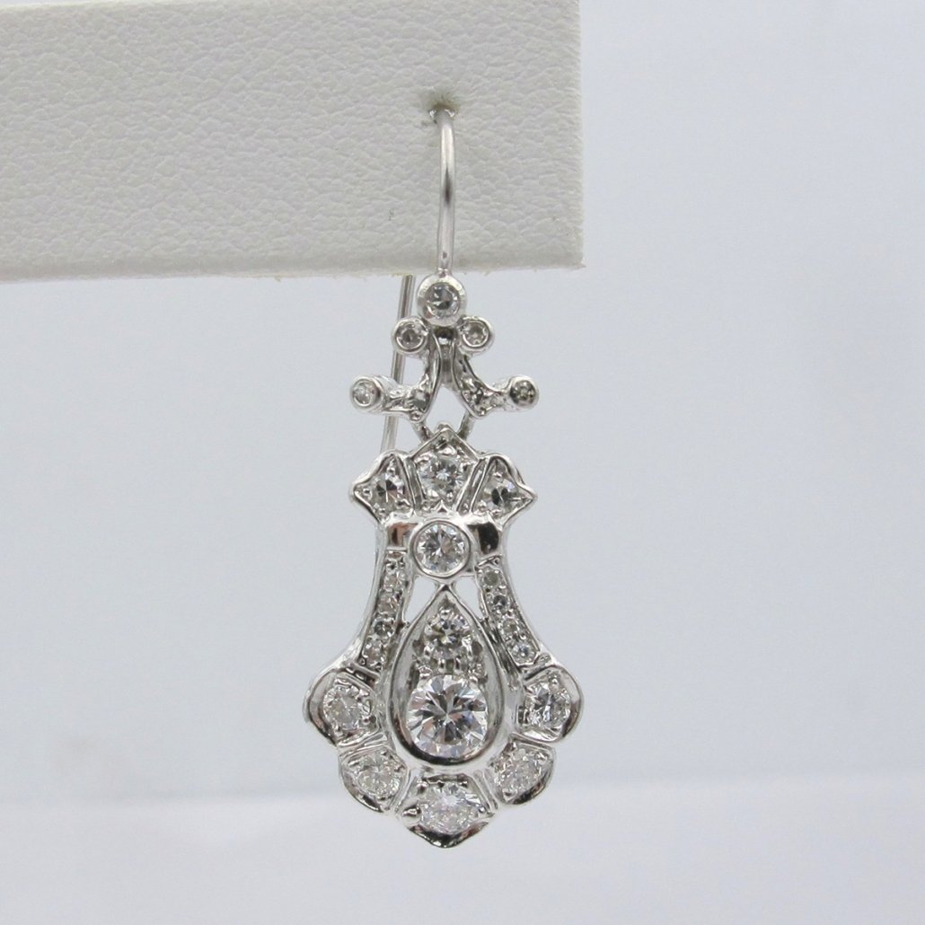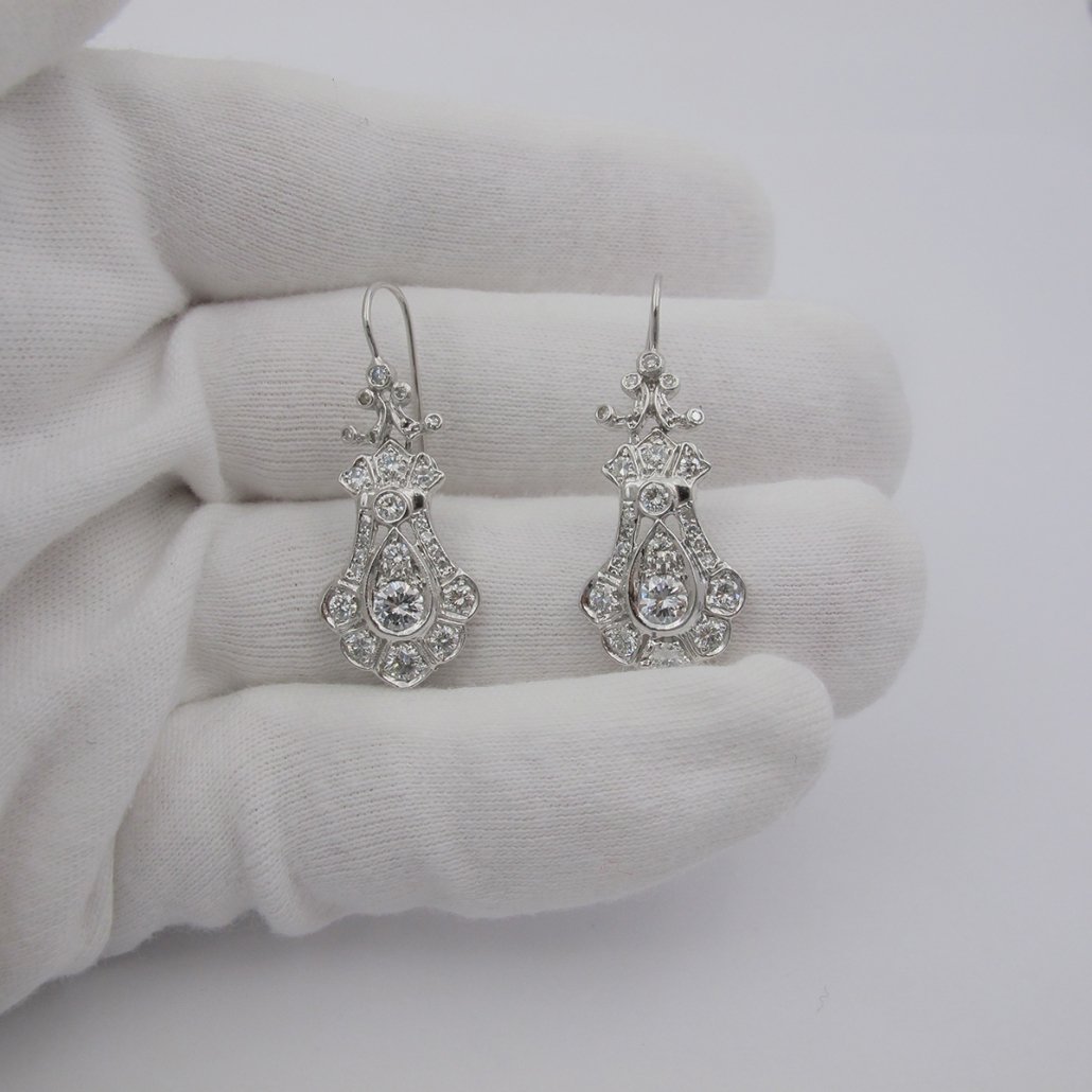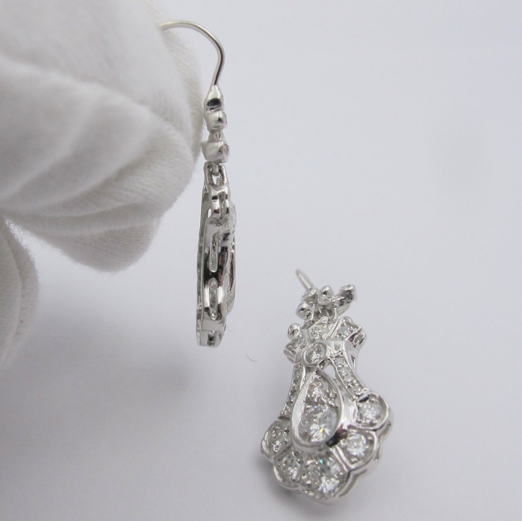 Victorian – Era influence is handcrafted in platinum and diamond in these dangling diamond earrings.