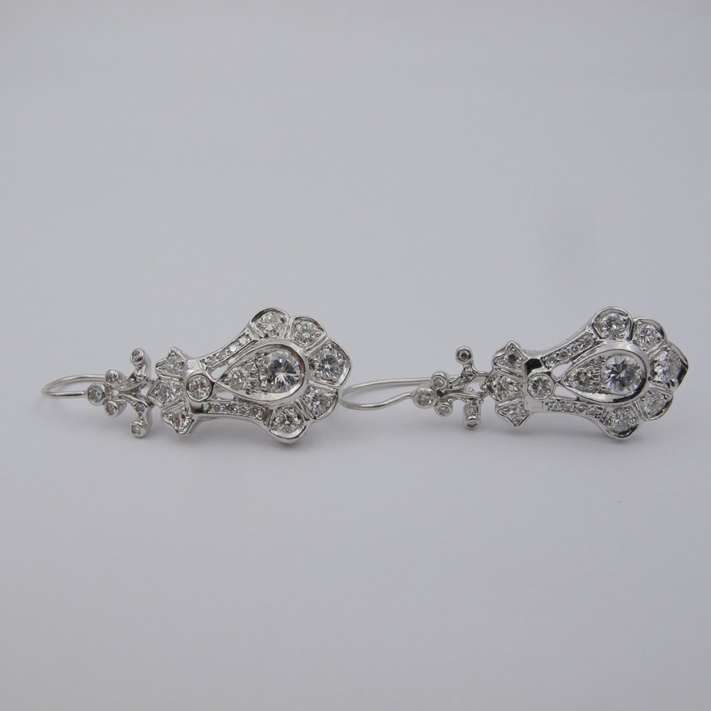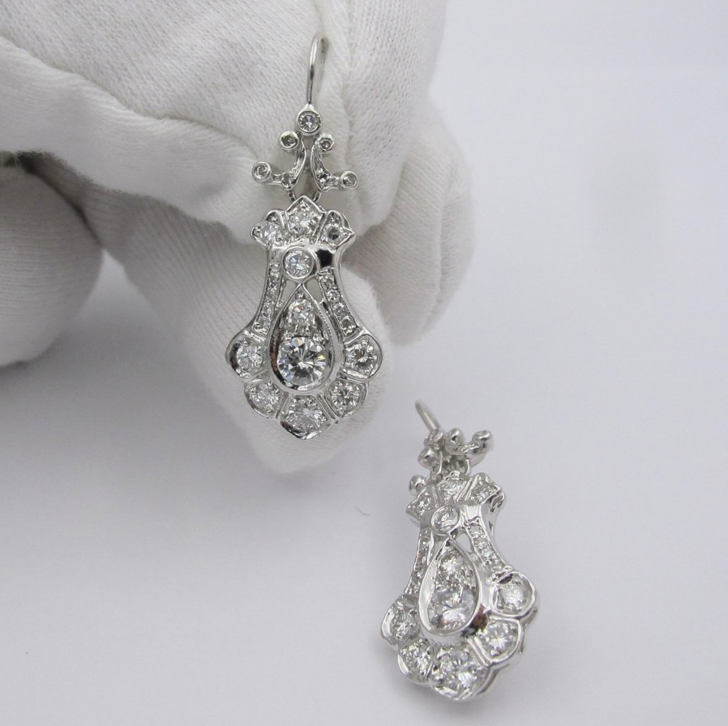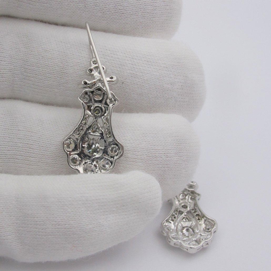 Victorian – Era influence is handcrafted in platinum and diamond in these dangling diamond earrings.