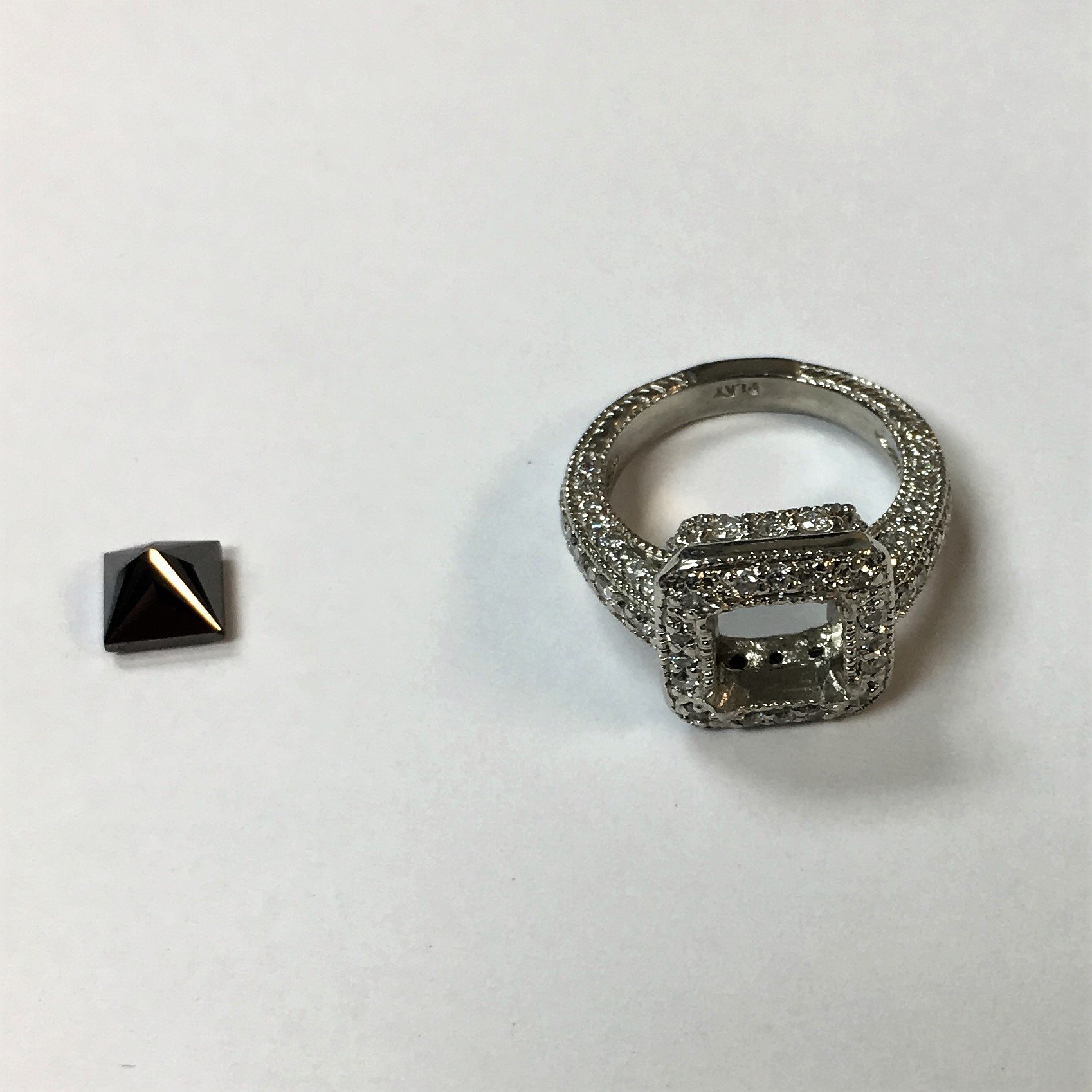 Culot side up! This fancy halo features a reverse set black diamond with fine mill grain work around the small diamonds on the shank.