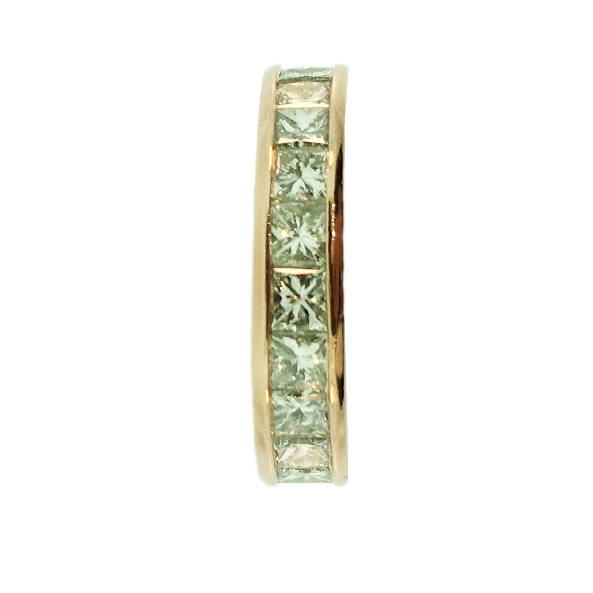 The ring has six side stones, with three diamonds channel set on each side of the center stone. They are 4mm in diameter and have a combined total weight of 1.69 carats. The diamonds are G color and VS1 clarity.