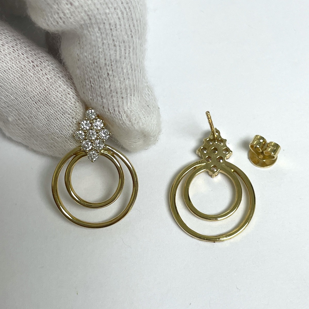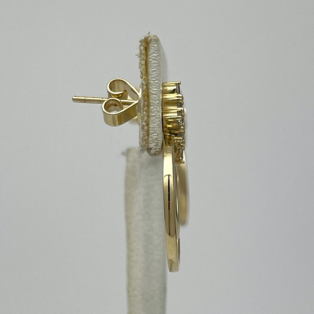 These earrings are made with 14k yellow gold and a shared prong cluster of round brilliant diamonds.