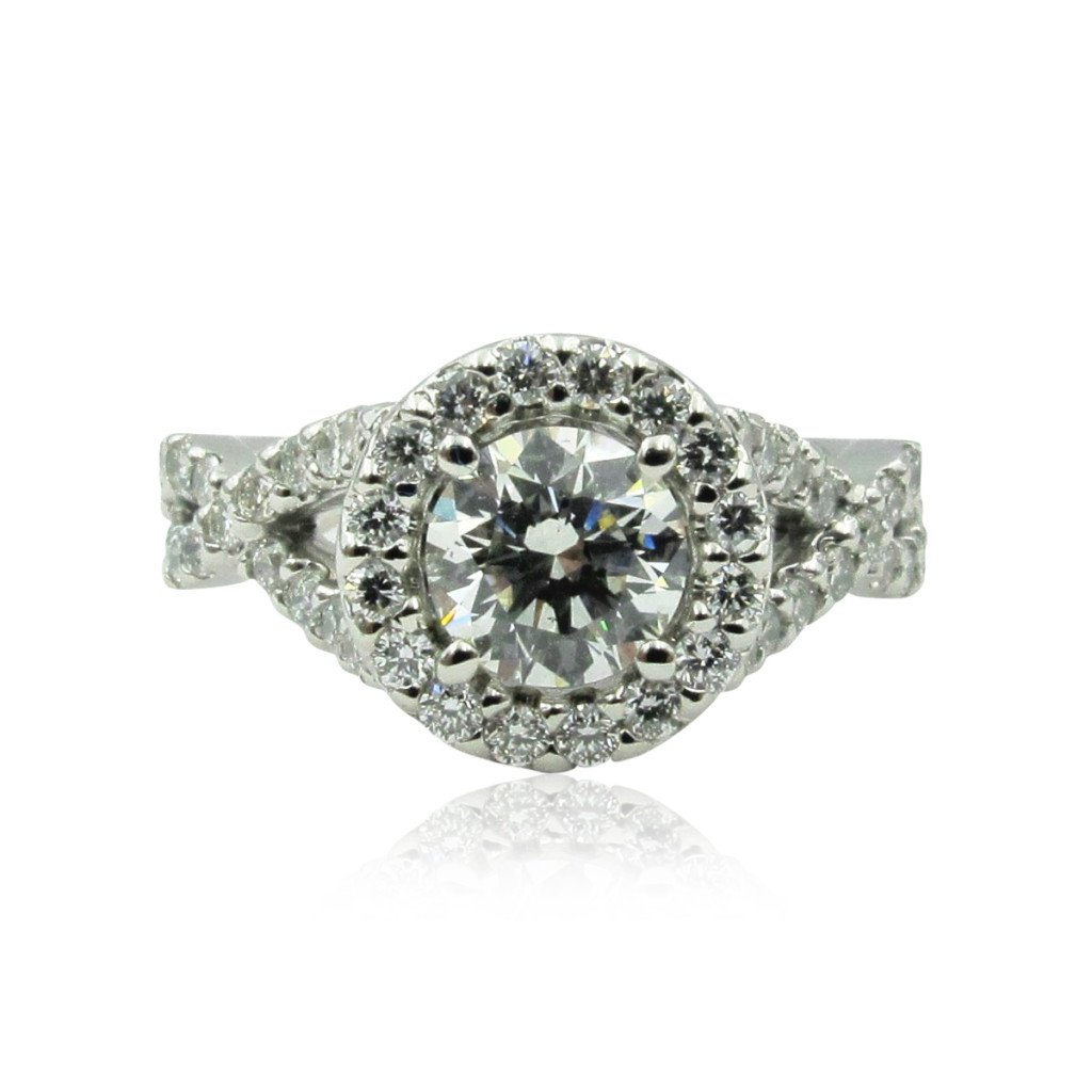 This diamond engagement is made of 14k white gold and weighs 5.10 grams.  The center stone is a natural round brilliant diamond that weighs 0.76carat. The diamond is GIA lab graded color H and clarity SI1. GIA lab report #2207942572. Additionally, the ring has sixteen small natural round brilliant diamonds prong set in a halo design around the center stone and thirty six small natural round brilliant diamonds prong set on the shank in an infinity design.  The total combined weight of the small diamonds is 0.63 carats. These diamonds are H color and SI clarity.