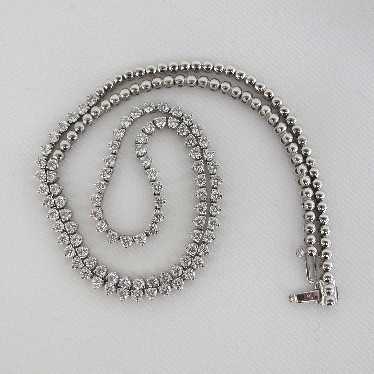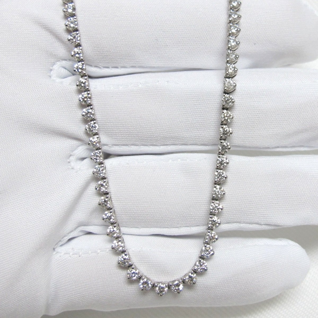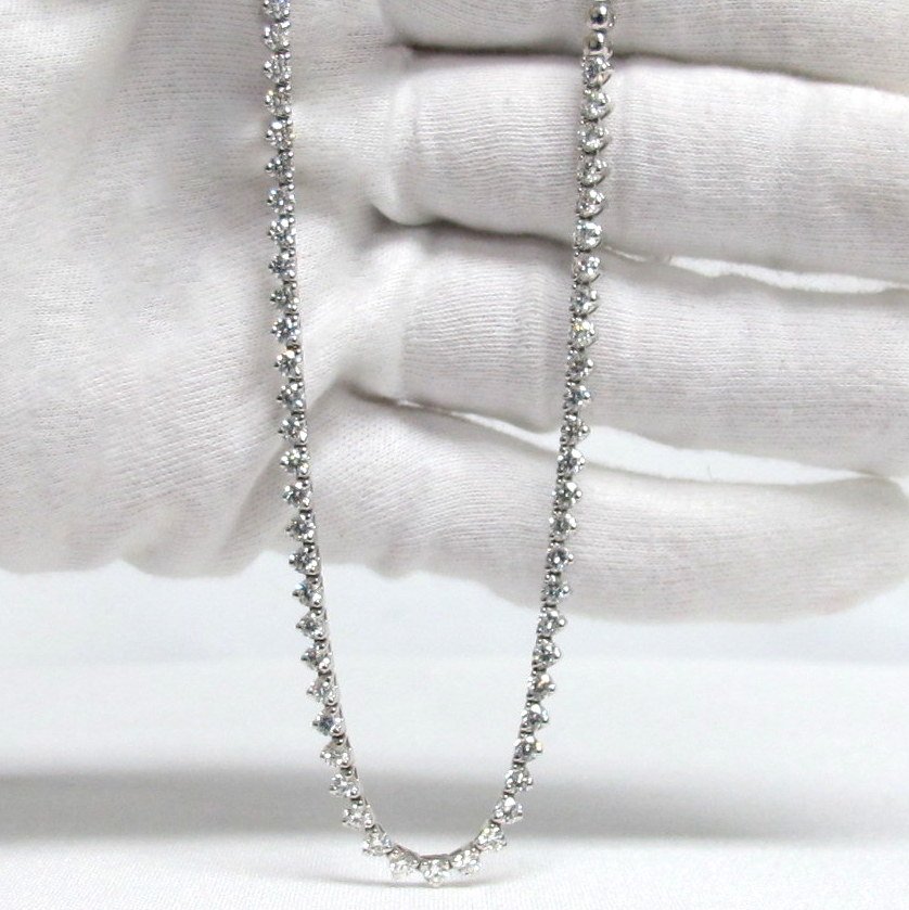 This necklace is 14k plumb white gold and contains ninety natural round brilliant diamonds that have a combined total weight of 6.80carats. Each stone is 2.7mm.