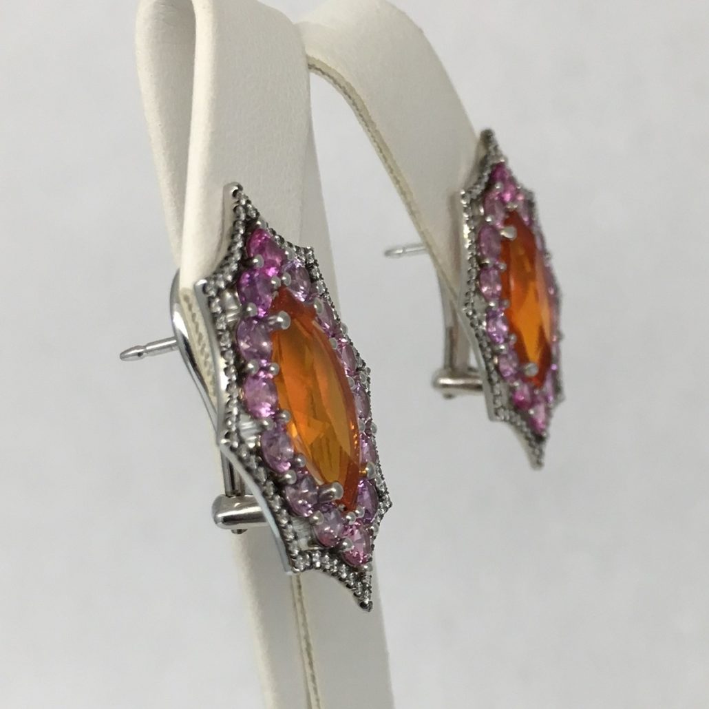 Tags 18k White, Black Rhodium, feather, Marquise, Mexican Fire Opal, Opals, Orange, Pink, Red, Sapphire, Shared Prongs, Spider, Stylish, Web