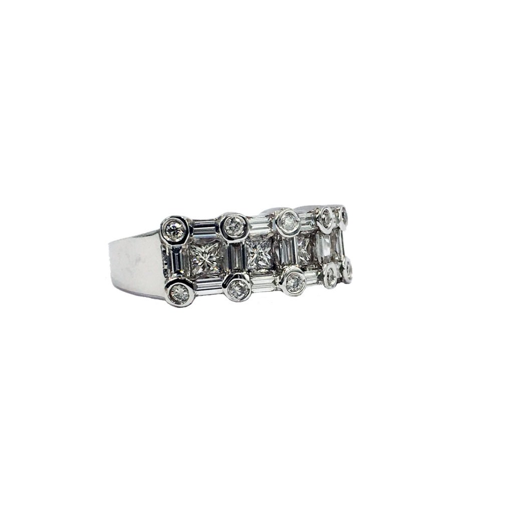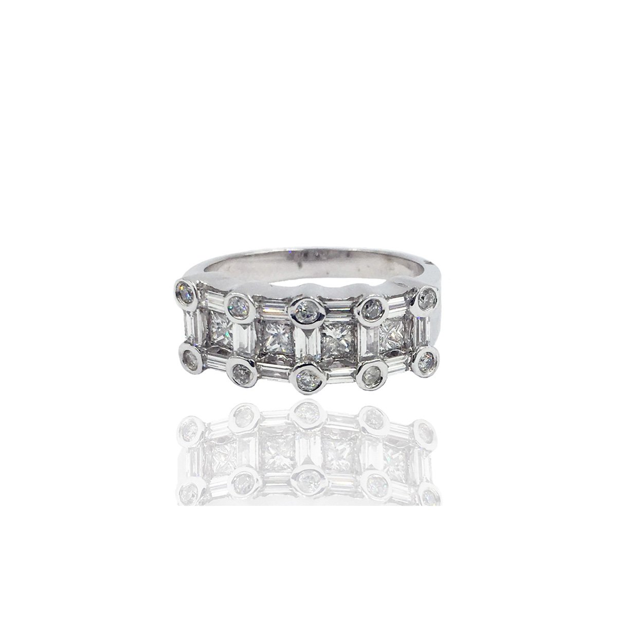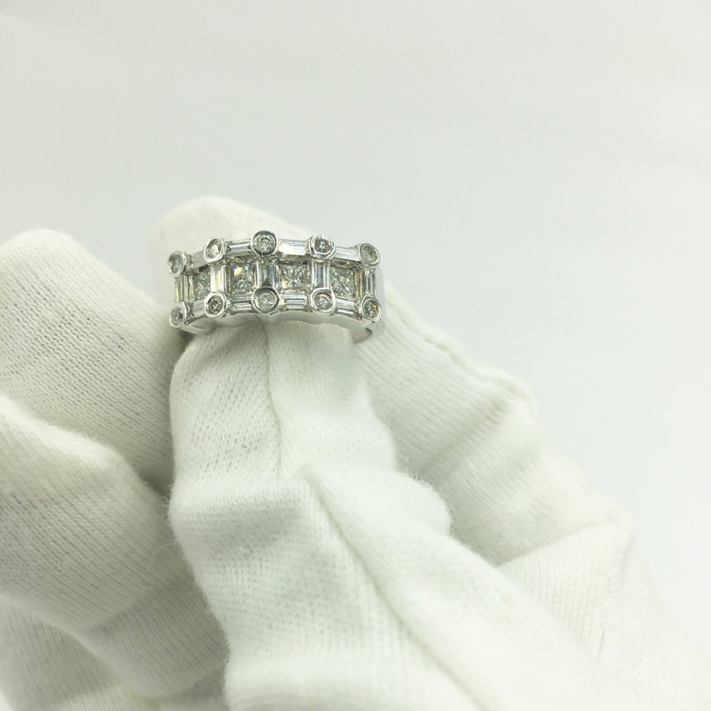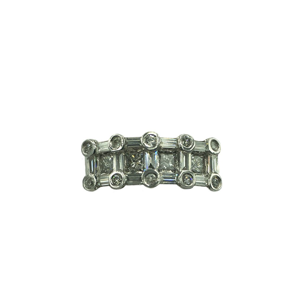 This unique diamond band is made with 14k white gold and custom set with natural baguettes, round brilliants, and princess cut diamonds.