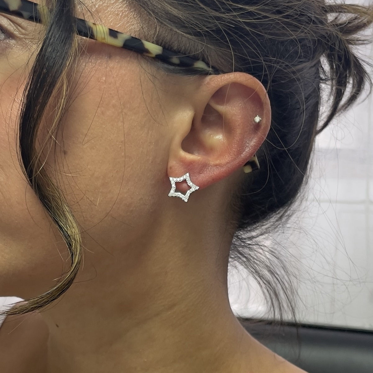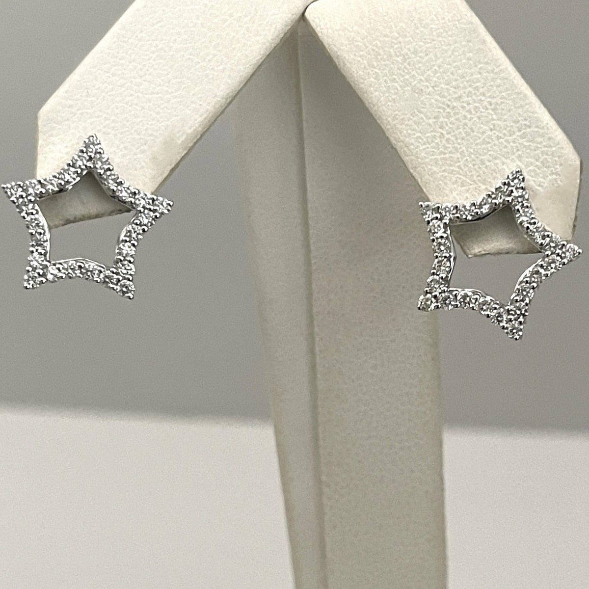 These 14k white gold star earrings are set with round brilliant diamonds.