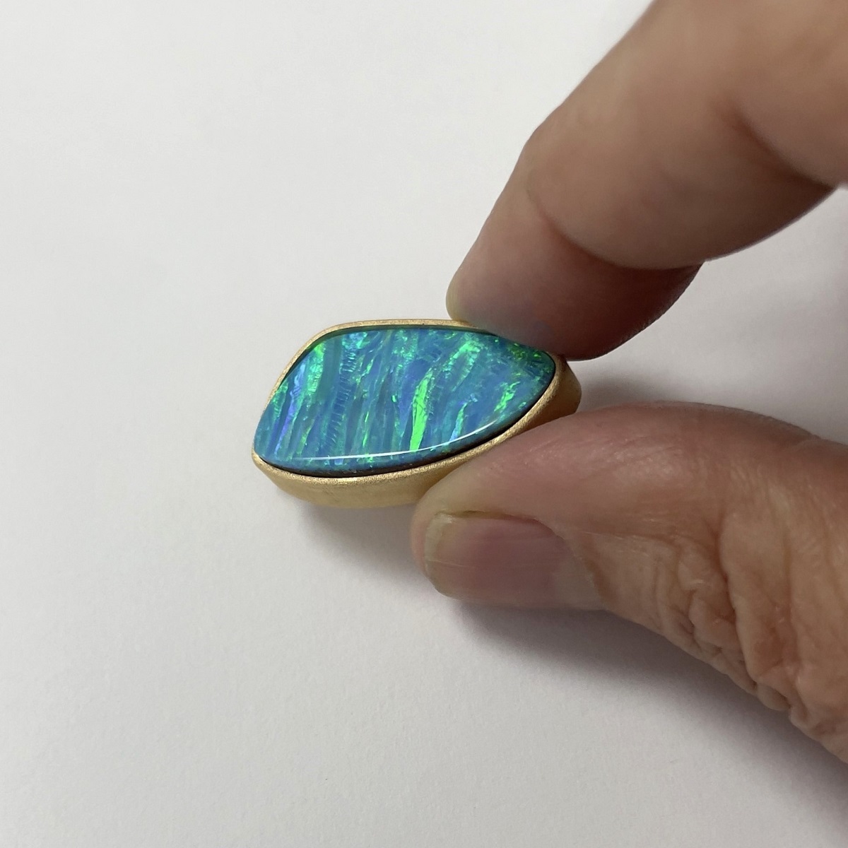 Natural abstract cut opal bezel set in 14k yellow gold.