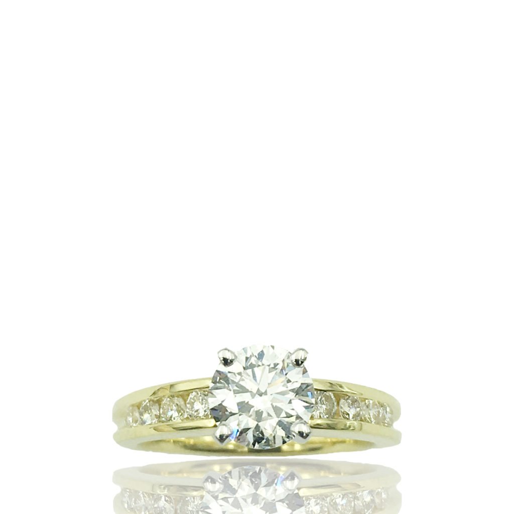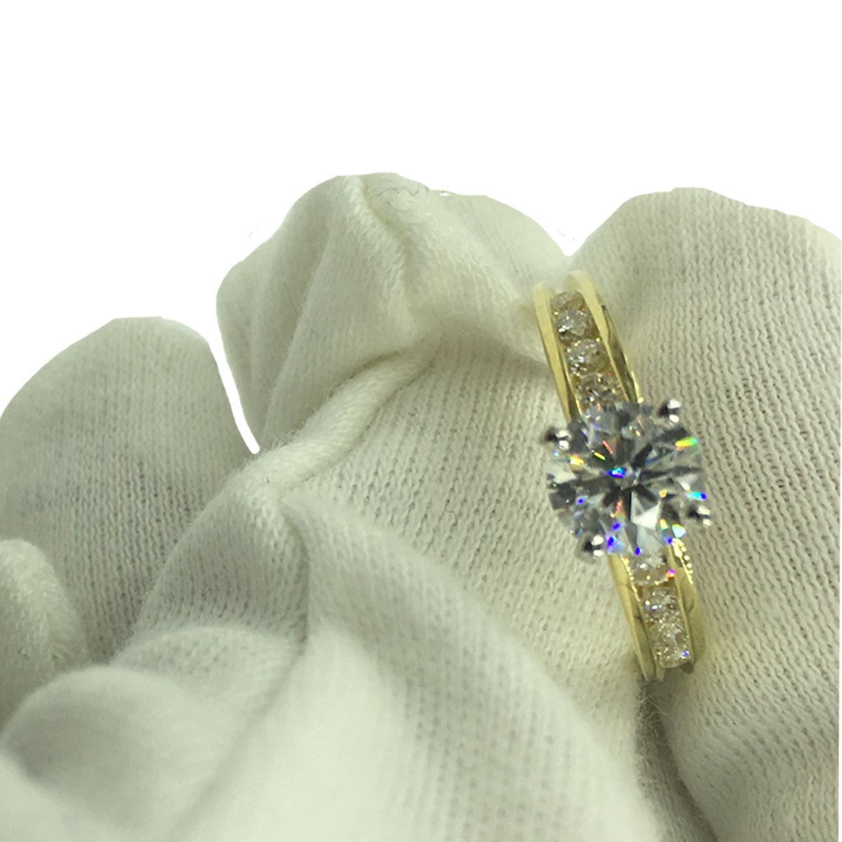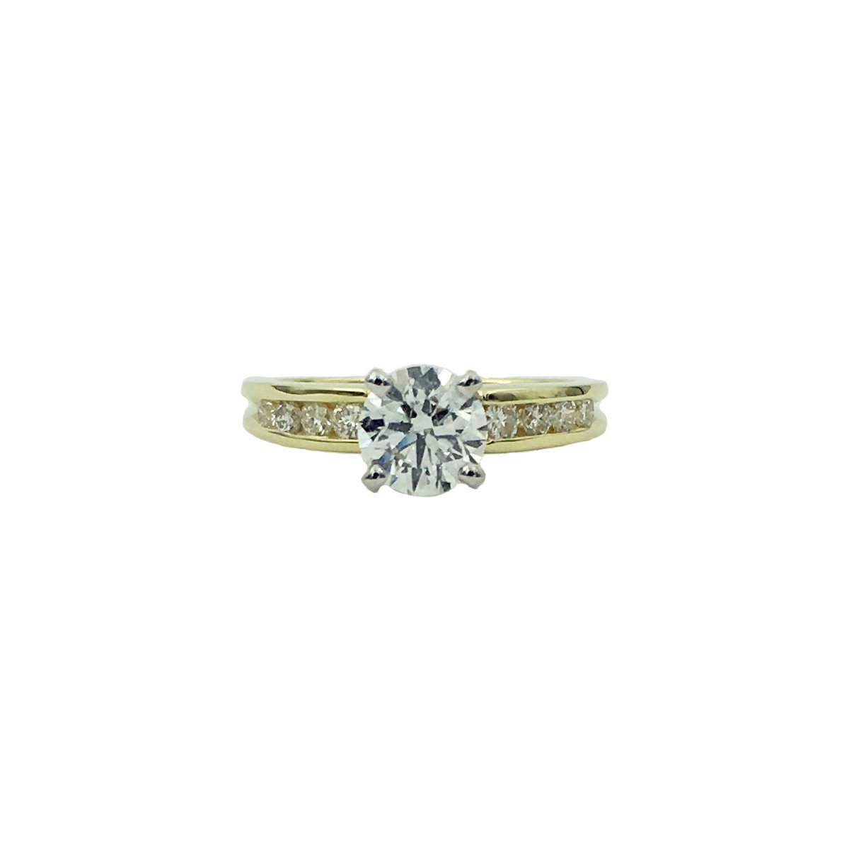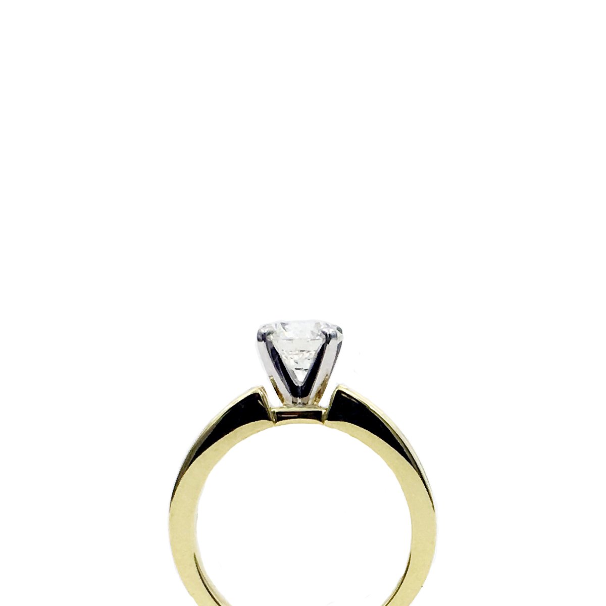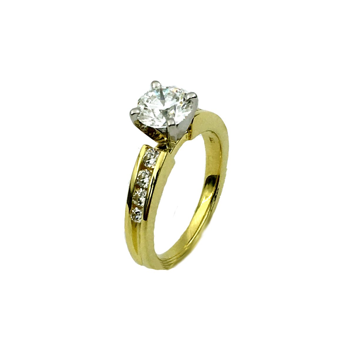 This ring is 18K yellow gold and weighs 4.90 grams. The center stone is a GIA certified natural round brilliant diamond, with a color of F, clarity of SI2. It weighs 0.96 carats. The center stone is set in a four prong white gold head.