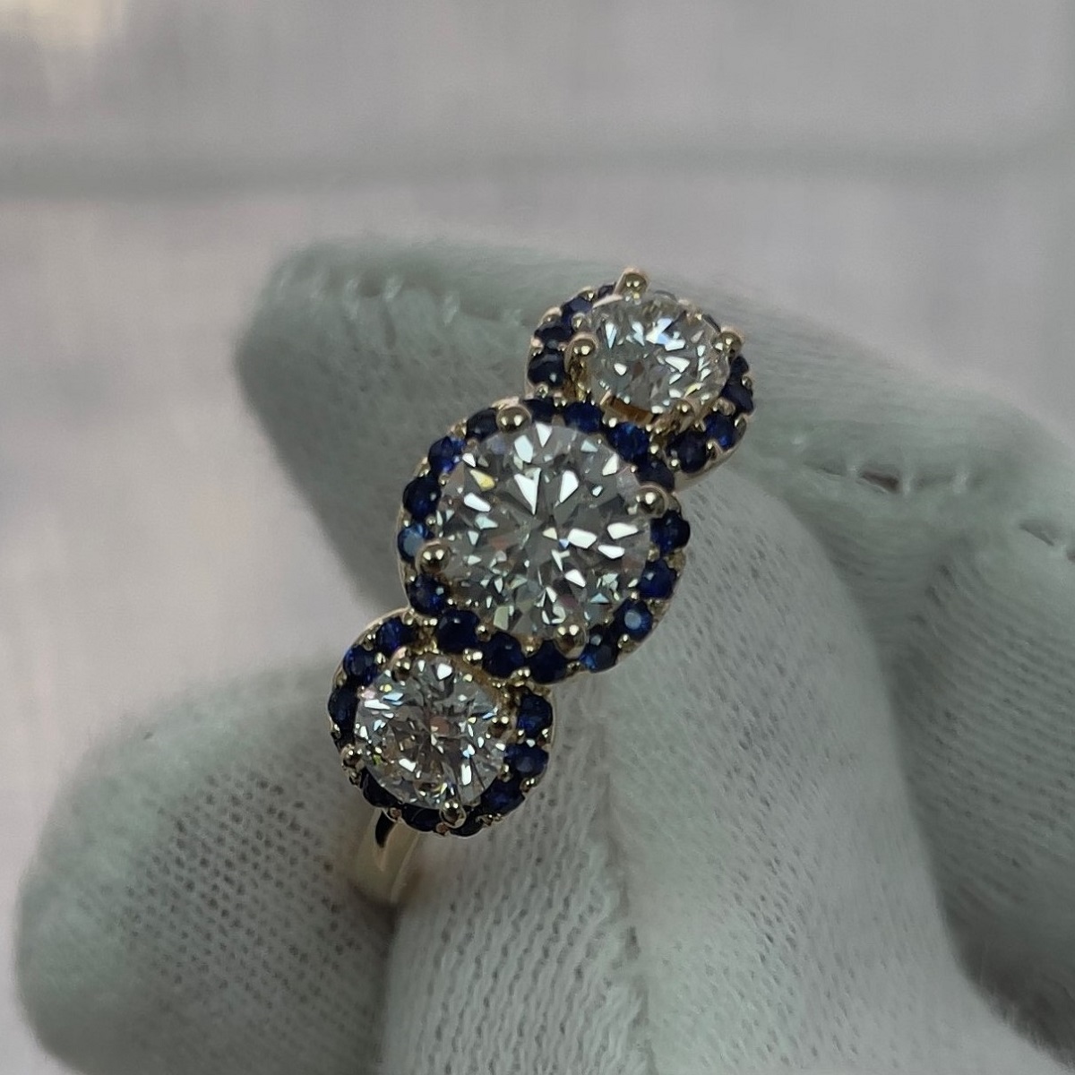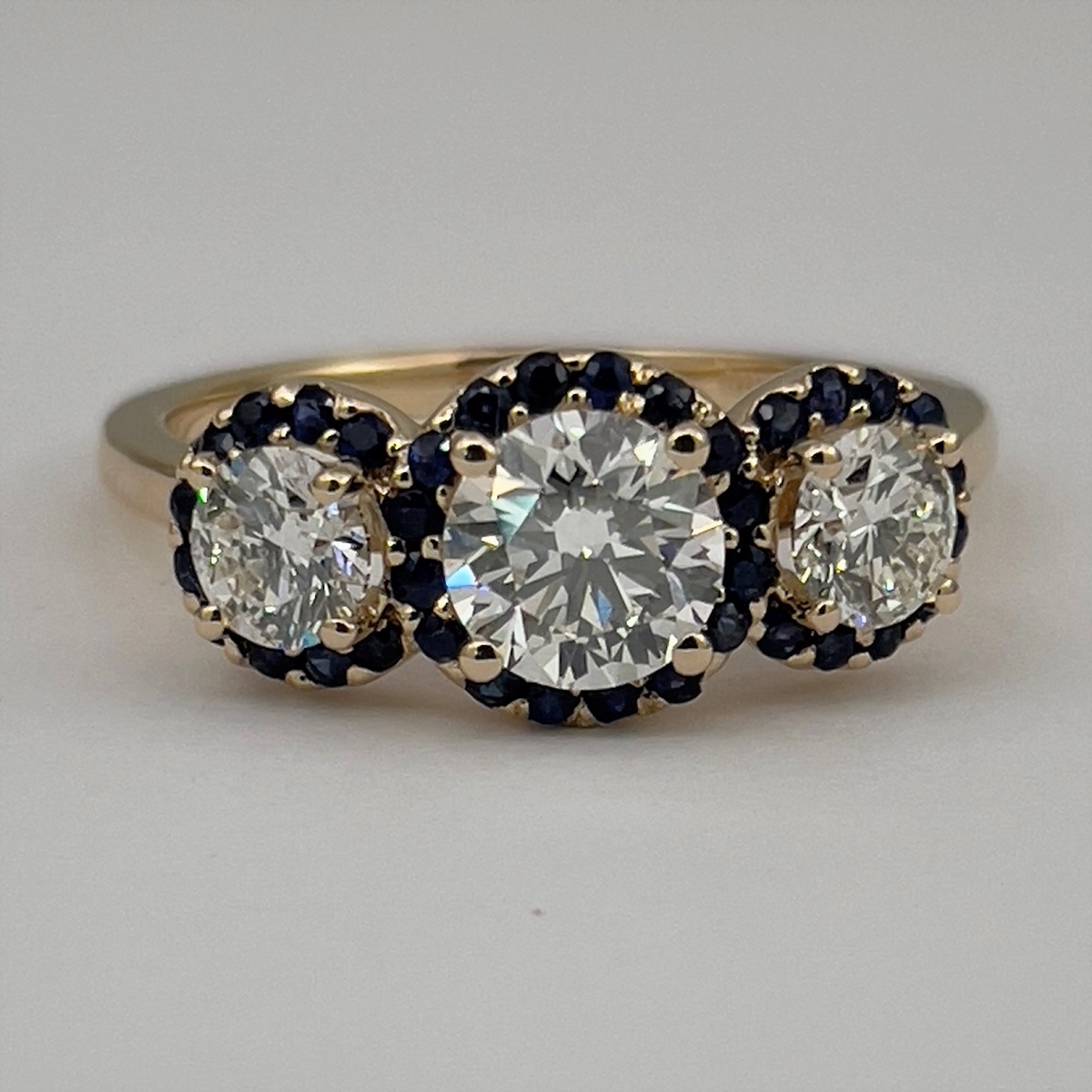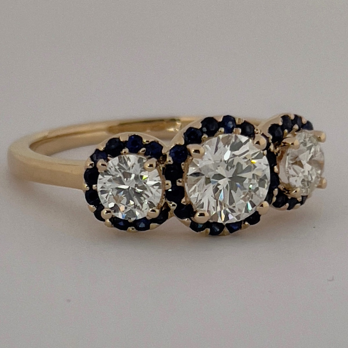 14k Yellow Gold Ring With Three Diamonds Surrounded By Small Blue Sapphires.