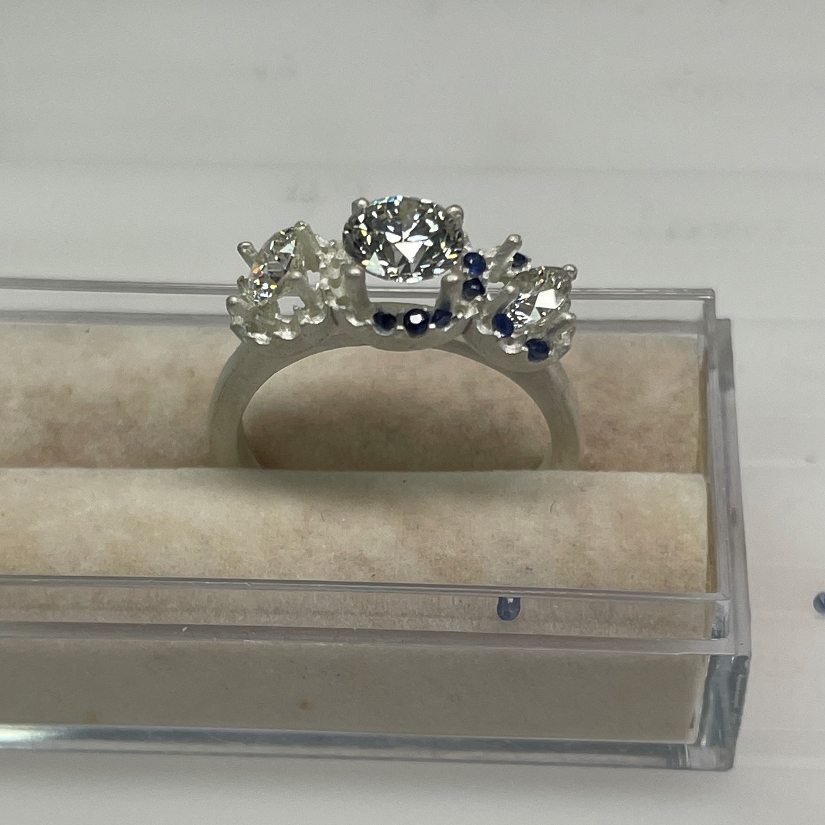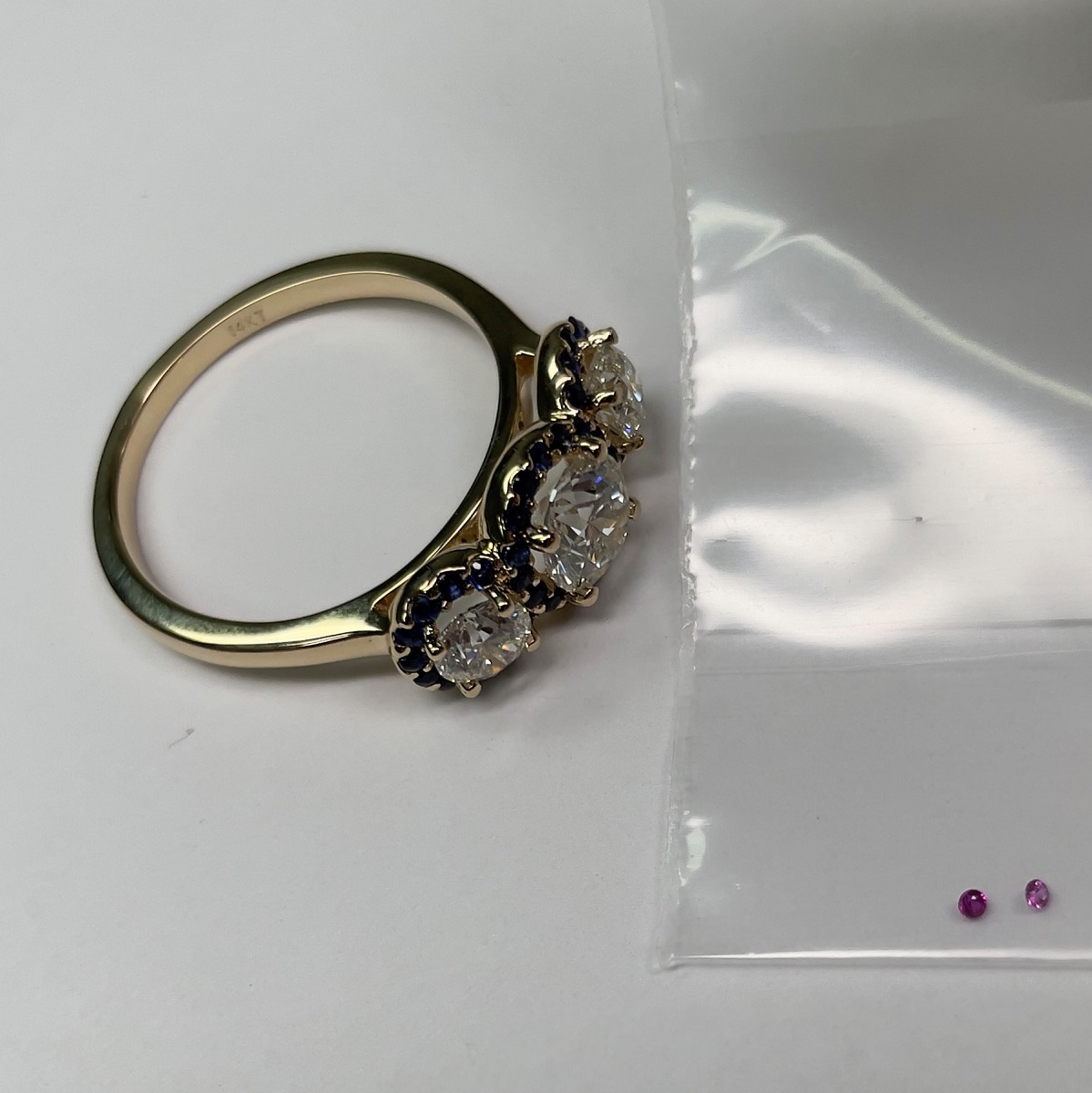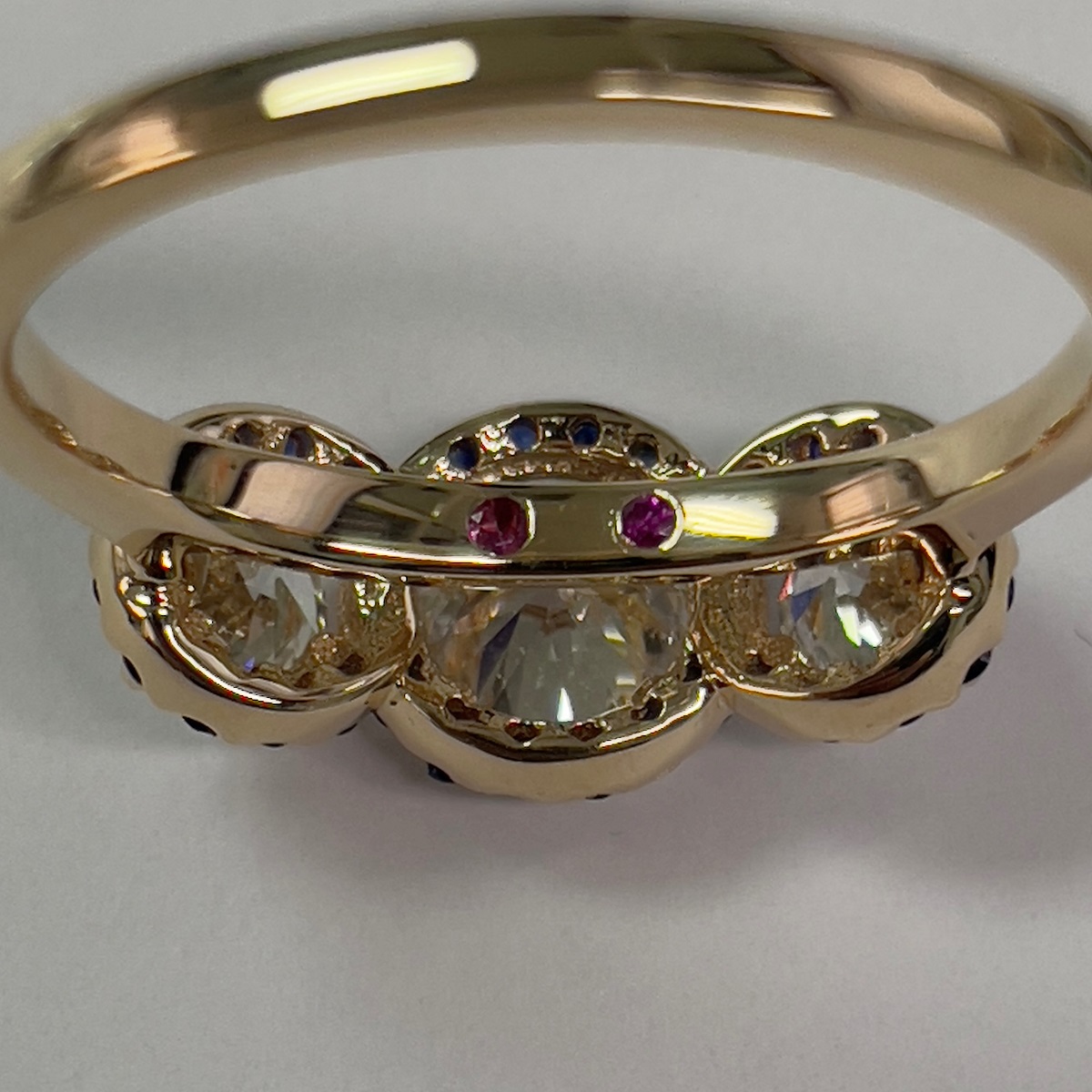 14k Yellow Gold Ring With Three Diamonds Surrounded By Small Blue Sapphires.