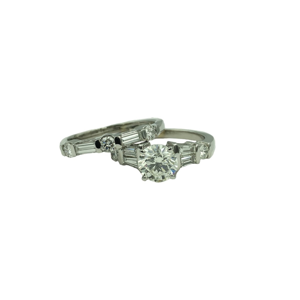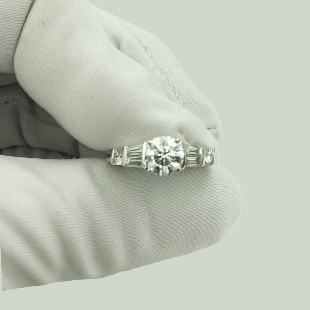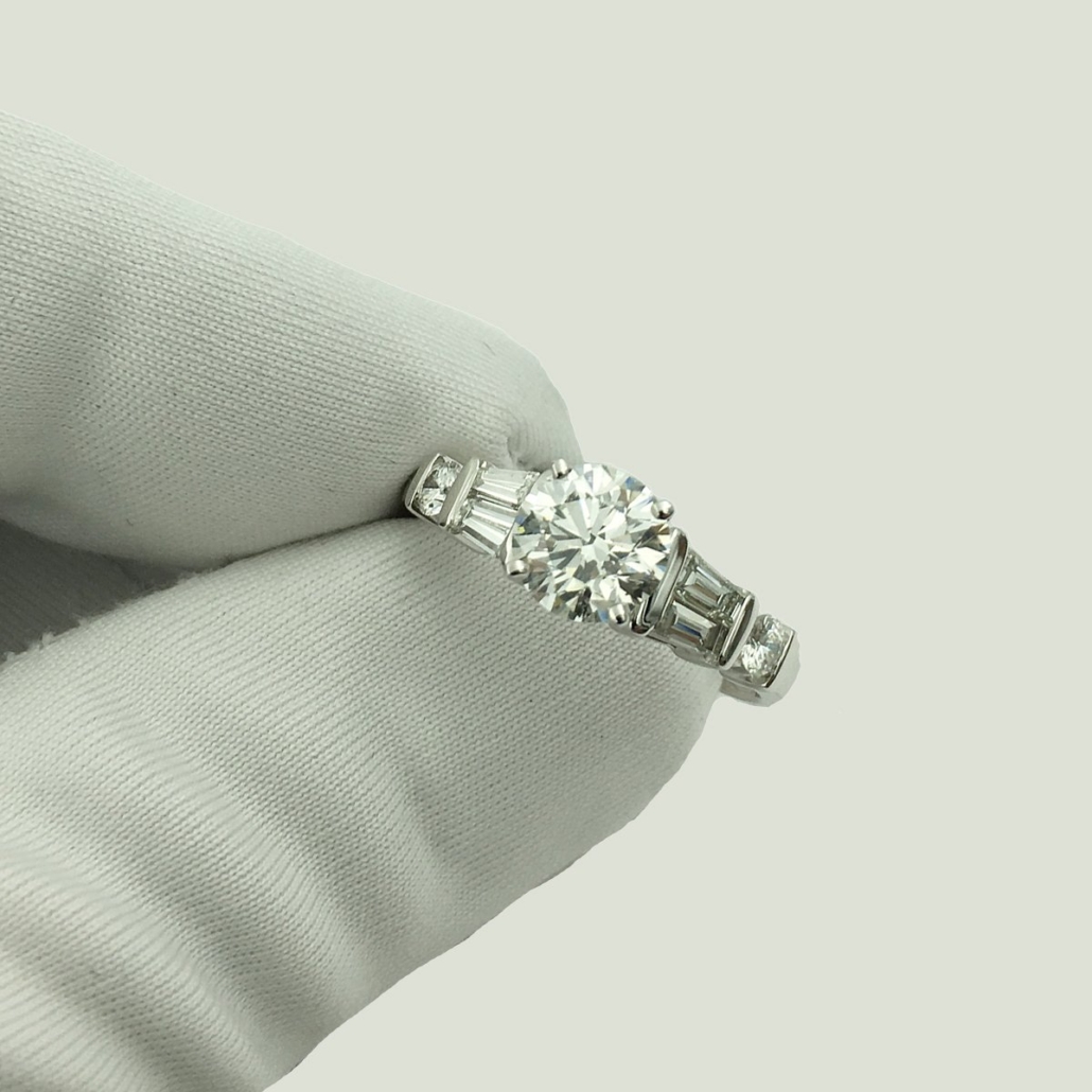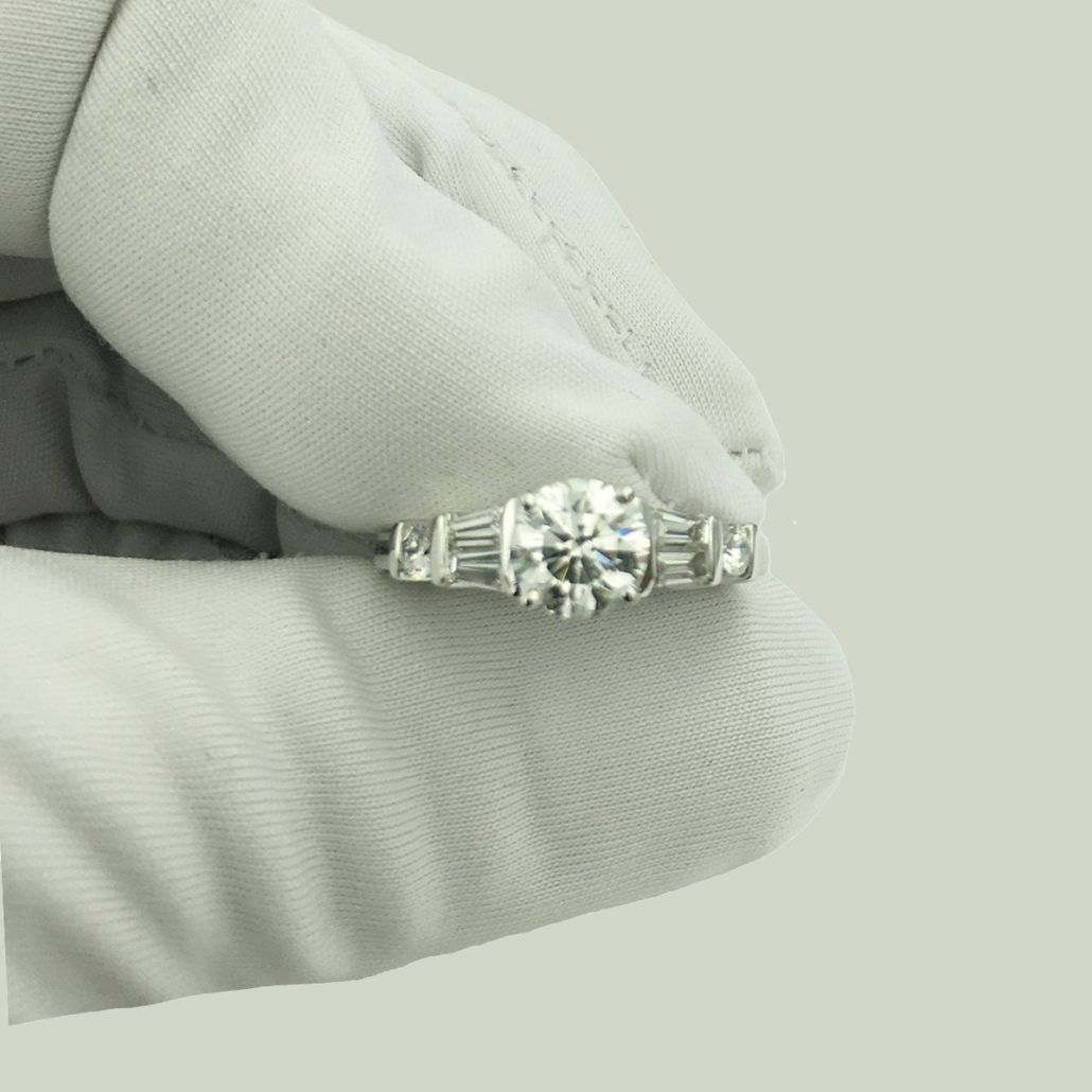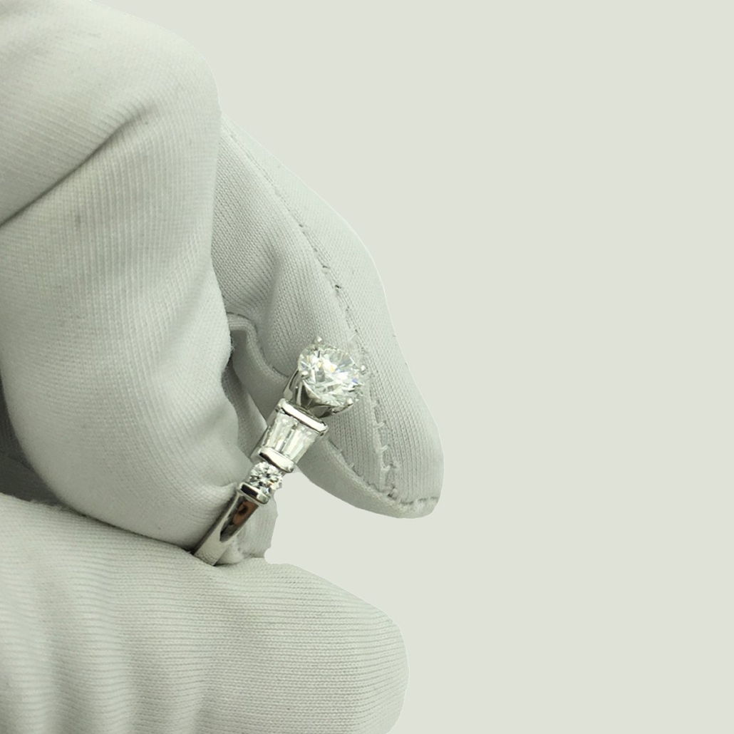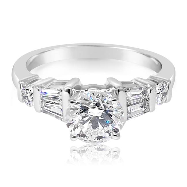 This ring features a round center diamond set in a 4-prong head. Additionally there are 4 tapered baguette diamonds and 2-small round diamonds, channel set side by side on either side of the center stone.