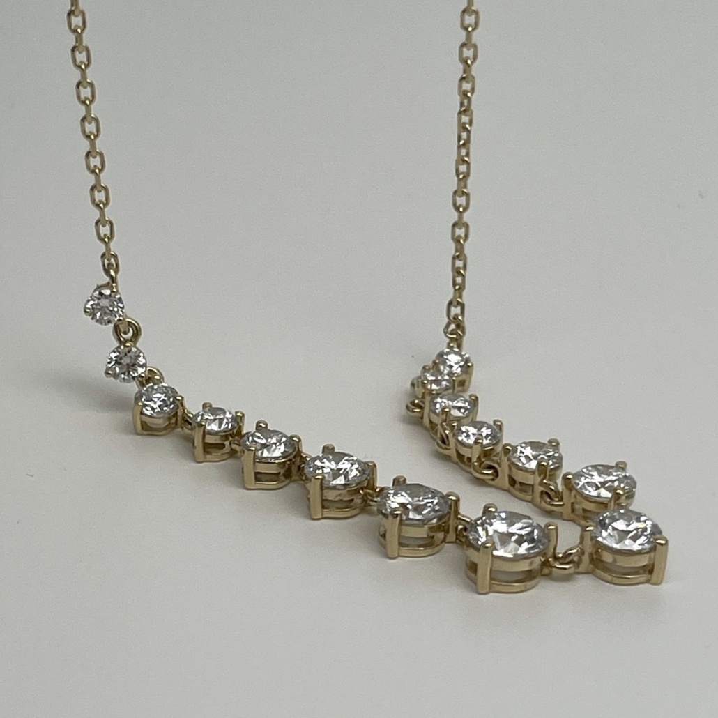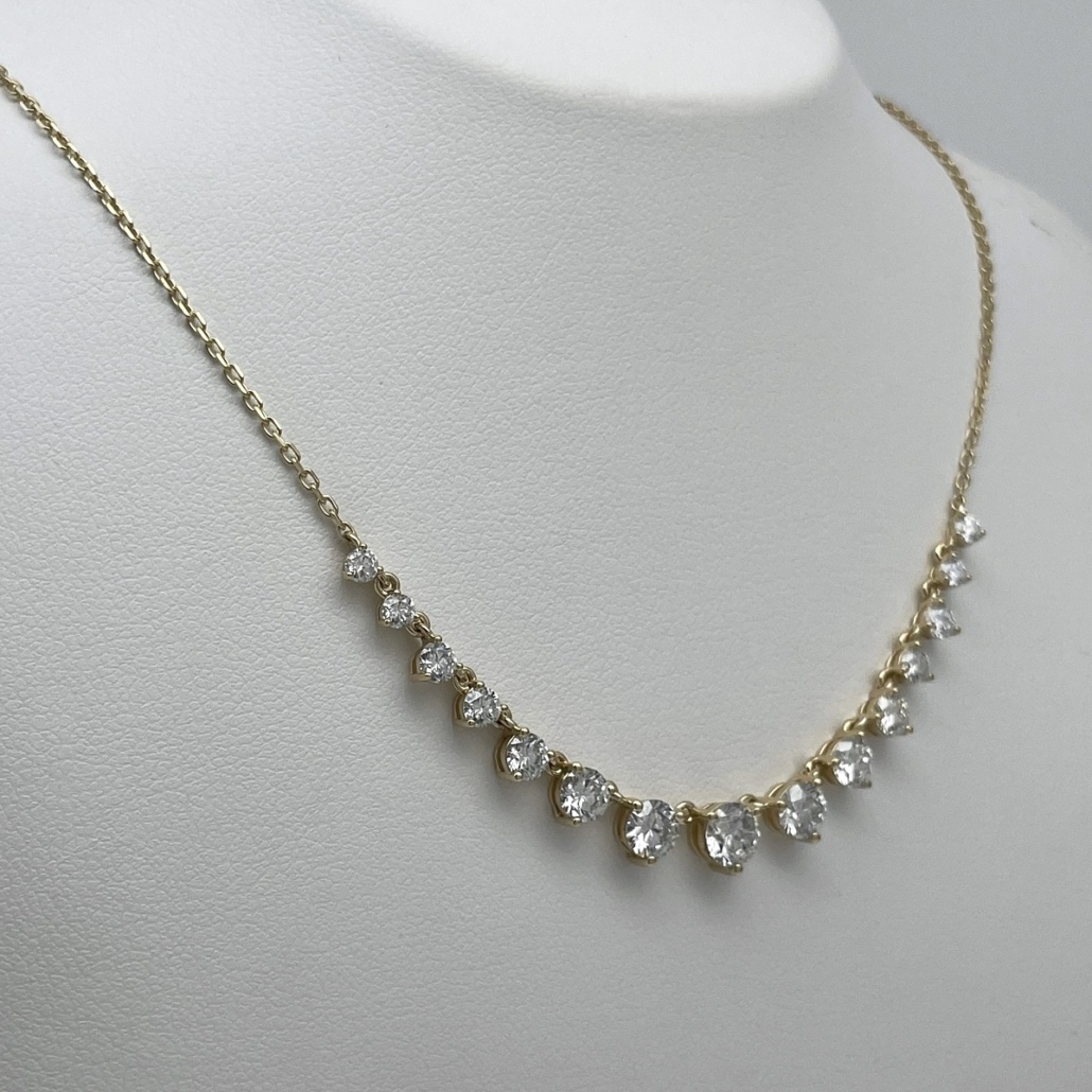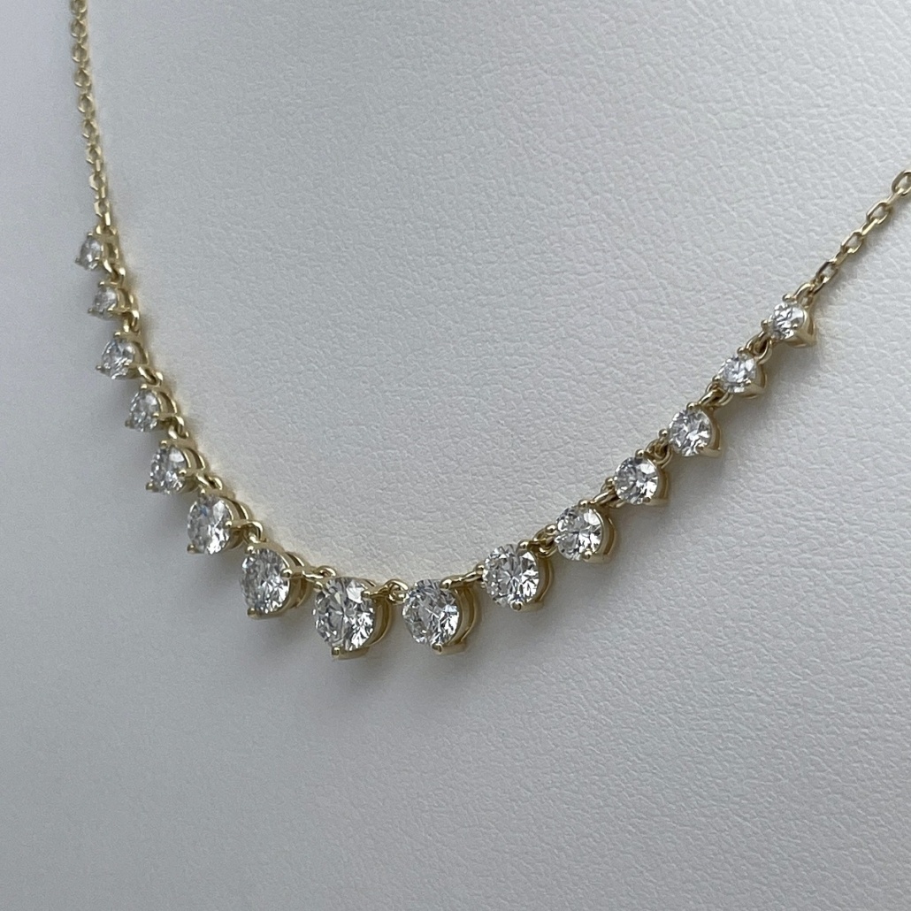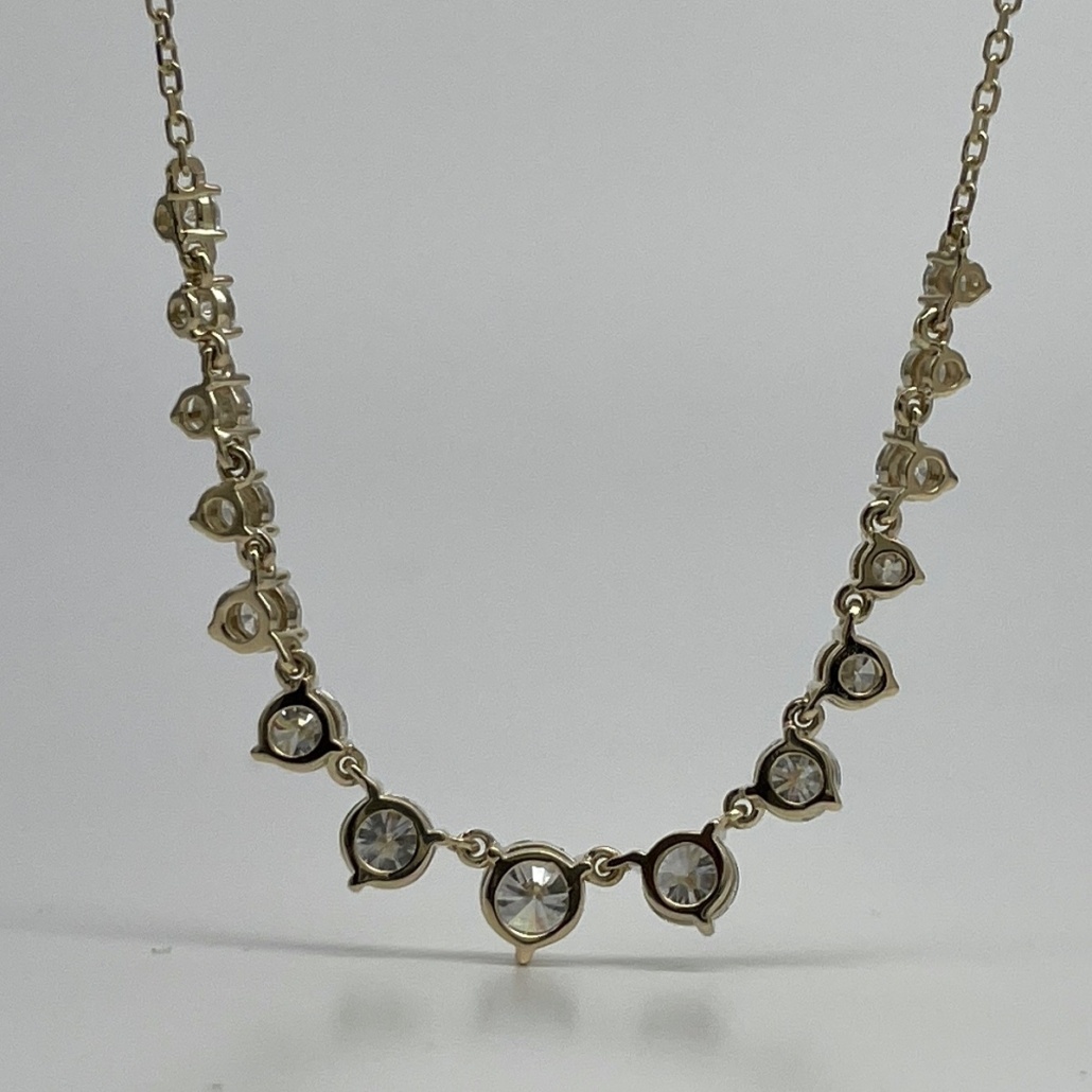 Crafted in 14k yellow gold and set with round brilliant diamonds in perfect harmony, this necklace flows gracefully along the neckline. The gradual increase in stone size creates a natural focal point that catches the light with every movement. Ideal for weddings, anniversaries, or unforgettable gifts.