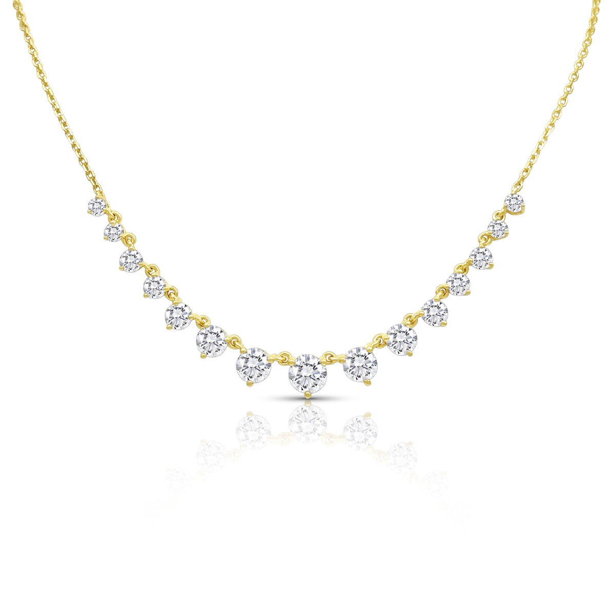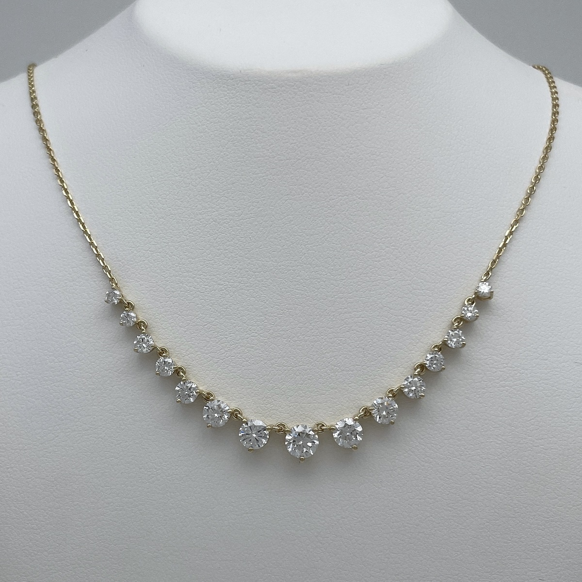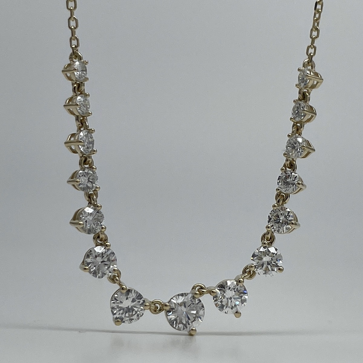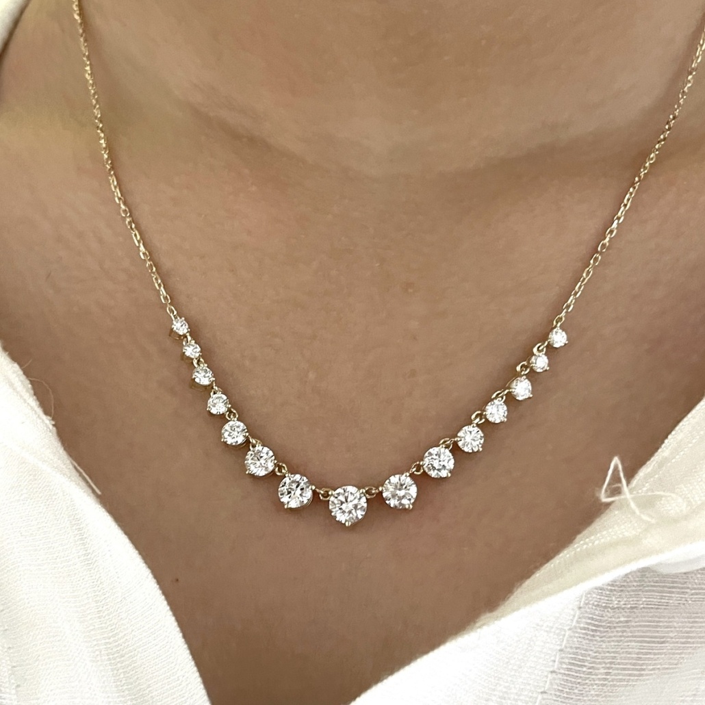 Crafted in 14k yellow gold and set with round brilliant diamonds in perfect harmony, this necklace flows gracefully along the neckline. The gradual increase in stone size creates a natural focal point that catches the light with every movement. Ideal for weddings, anniversaries, or unforgettable gifts.