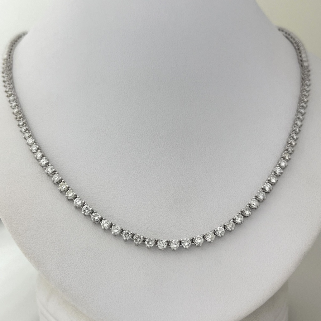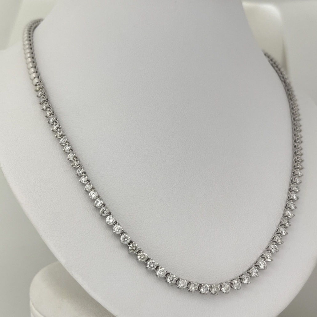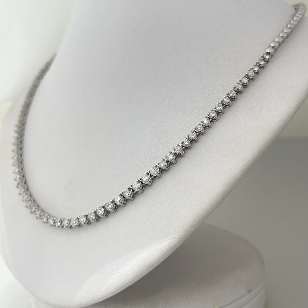 This elegant necklace is made with 14k white gold and diamonds that are three prong set.