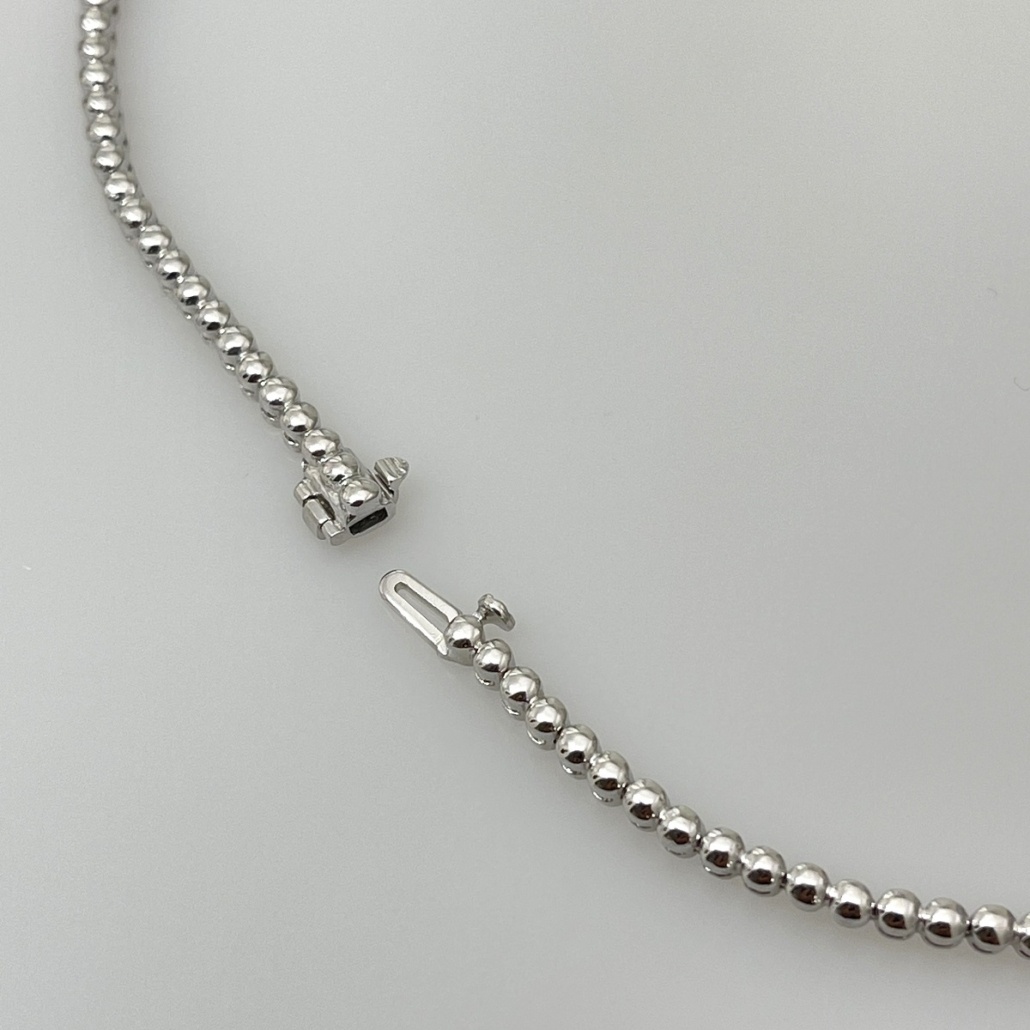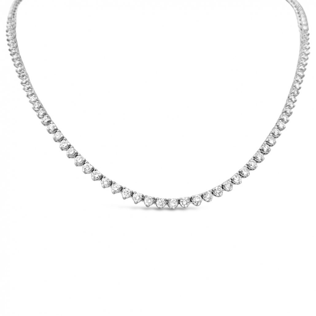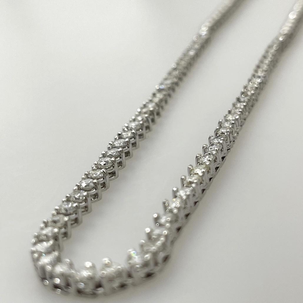 This elegant necklace is made with 14k white gold and diamonds that are three prong set.