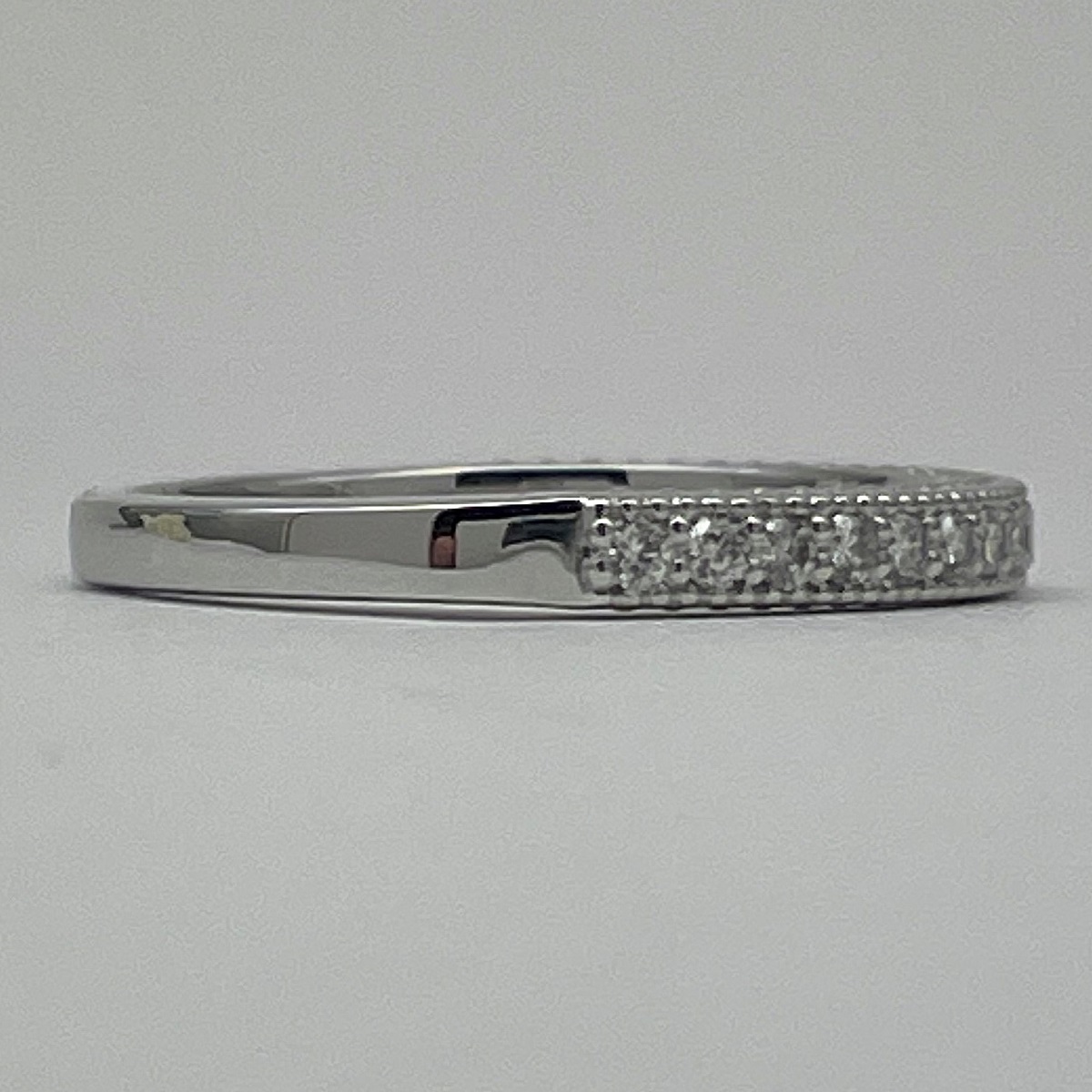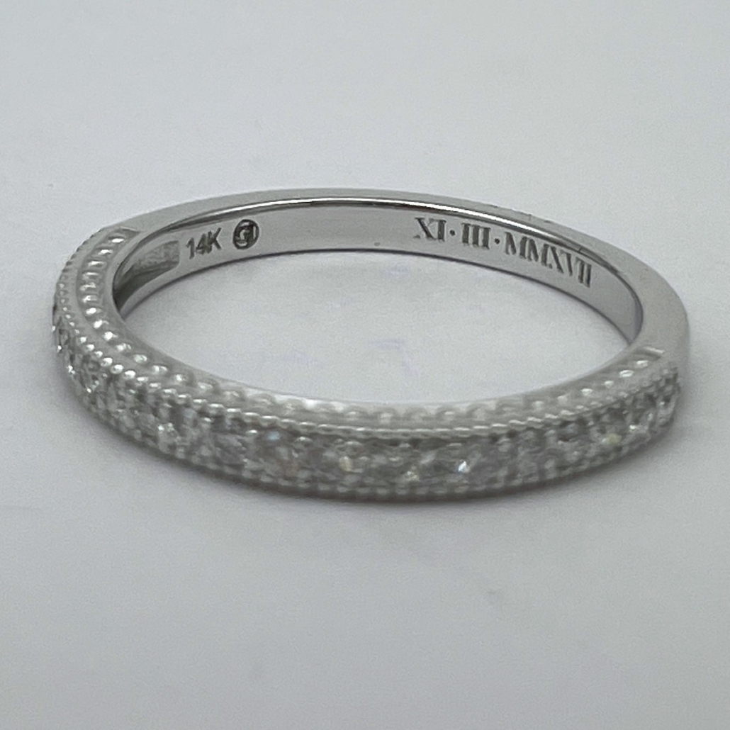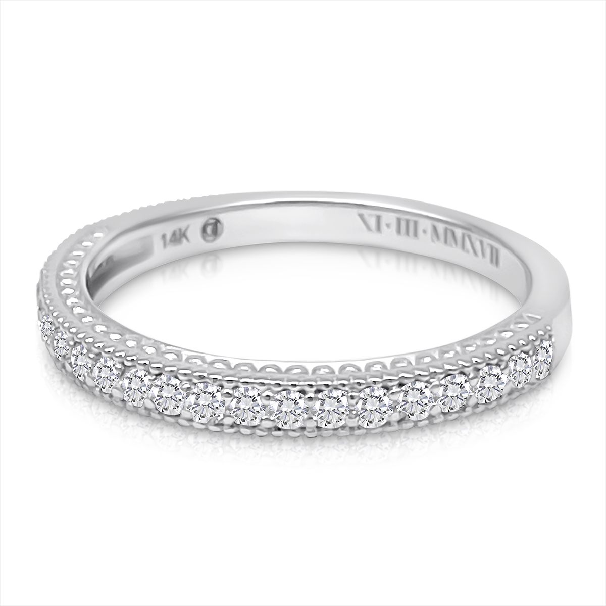 Set in polished white gold and framed with delicate migraine detail, it’s the perfect complement to a lifetime of love.