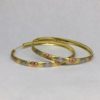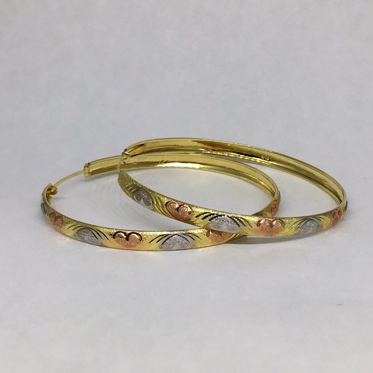 These hoops are 2.25” in diameter. They have a satin finish with diamond cut hearts and swirls design.