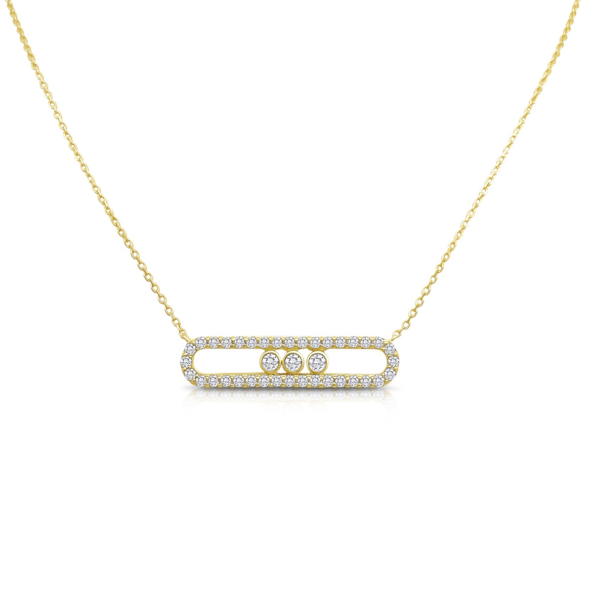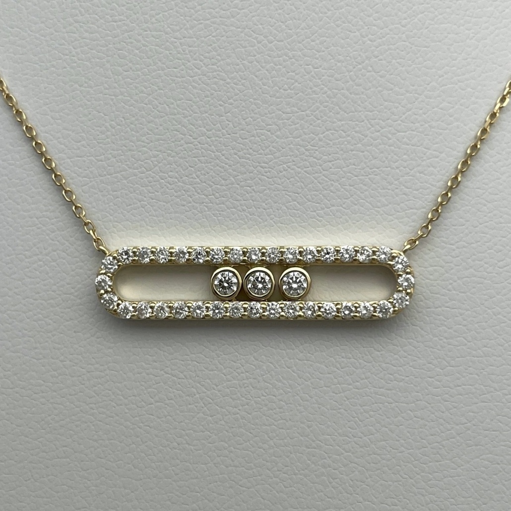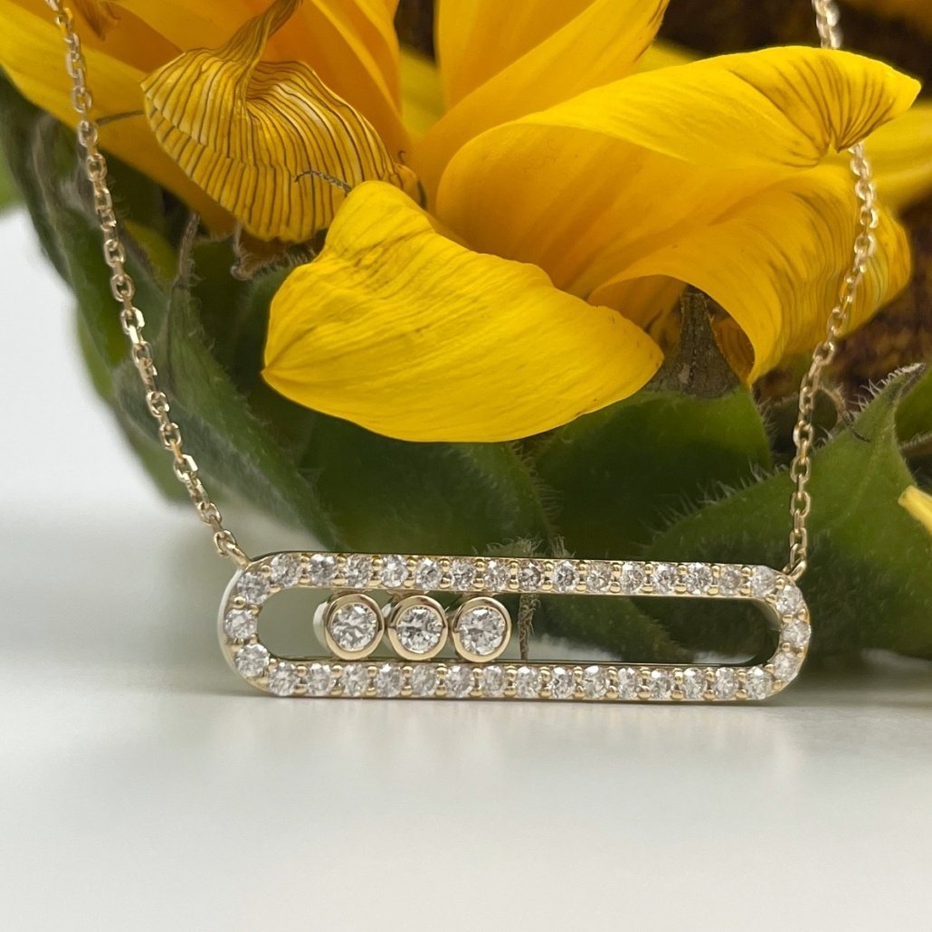Designed to shine in motion. Three bezel-set diamonds glide smoothly within a diamond-lined bar, catching and reflecting light with every step.
