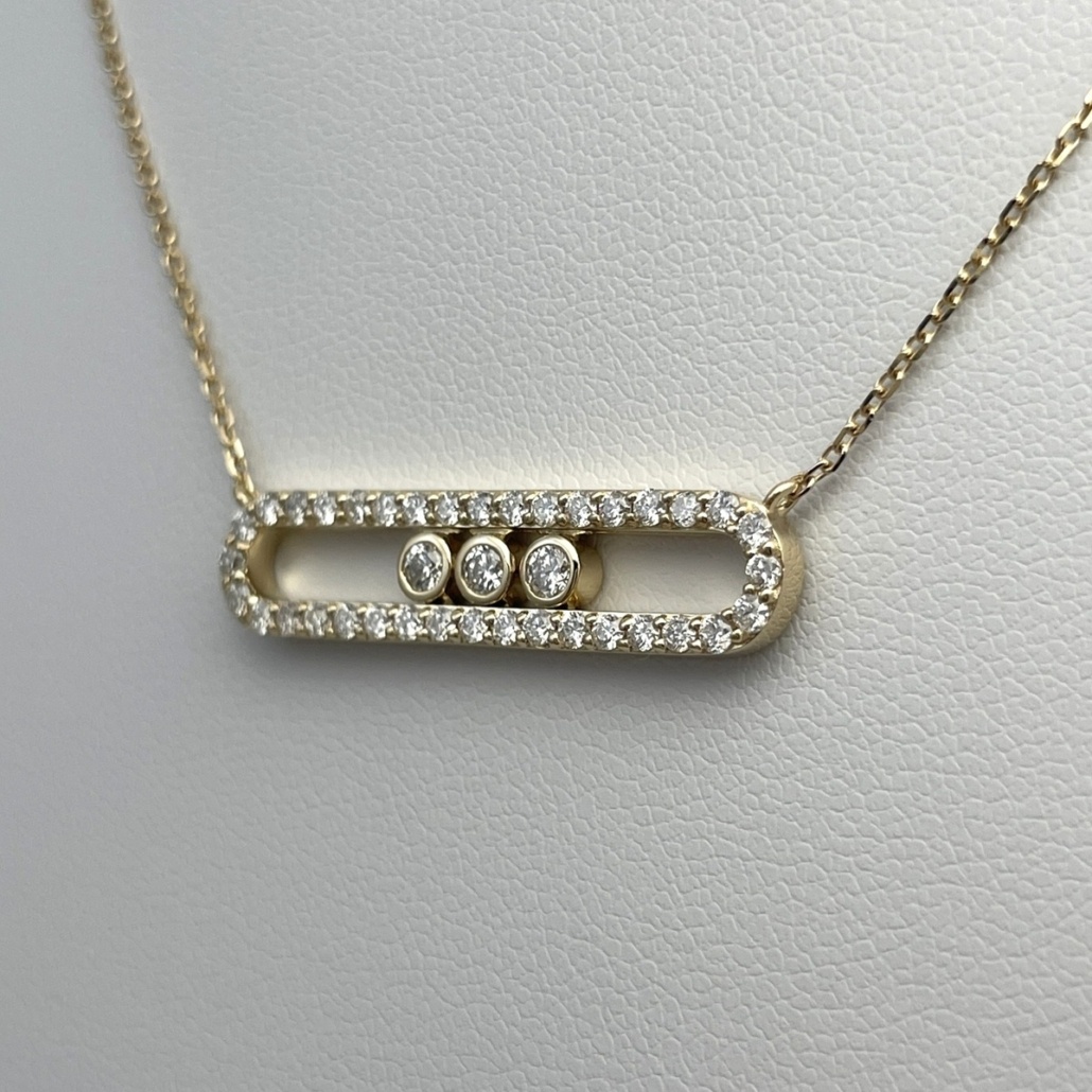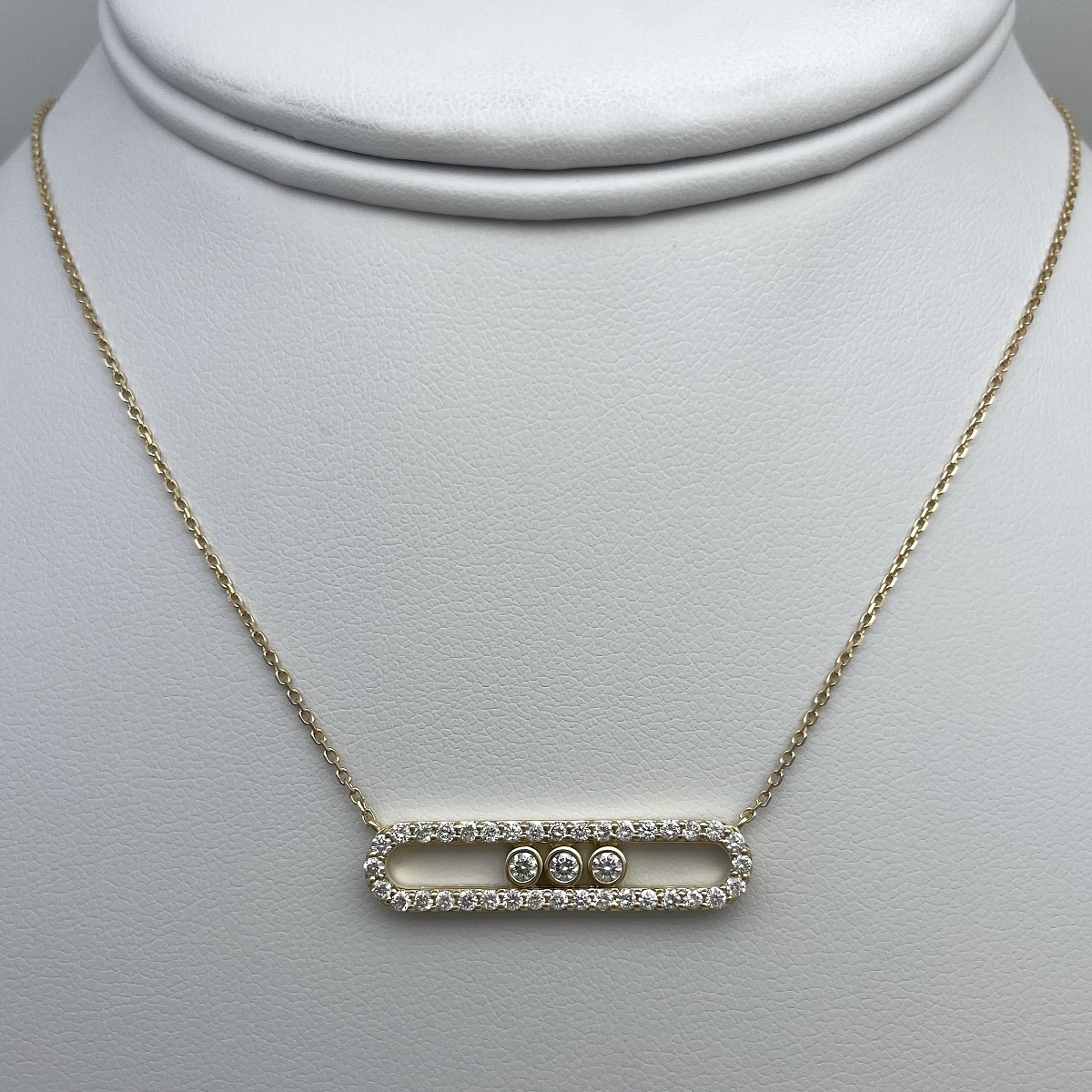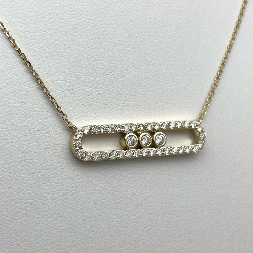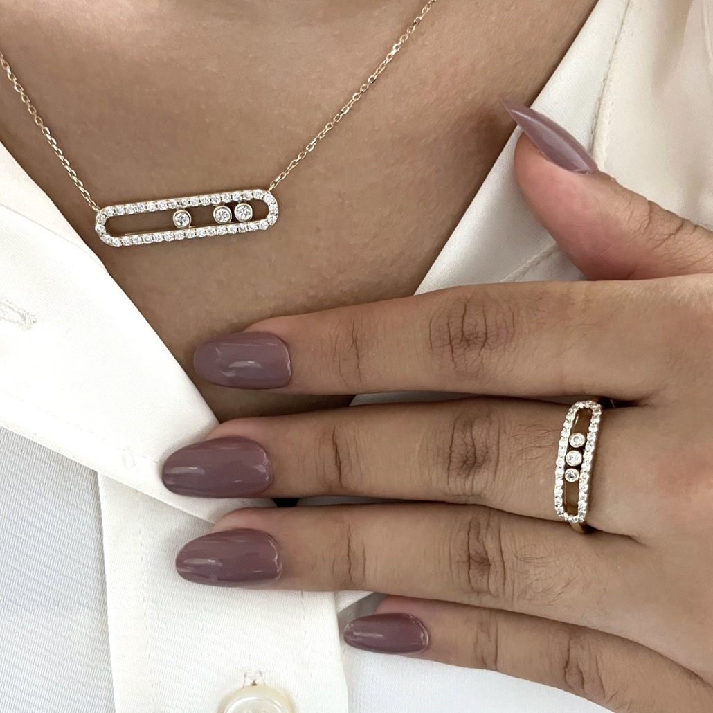 Designed to shine in motion. Three bezel-set diamonds glide smoothly within a diamond-lined bar, catching and reflecting light with every step.