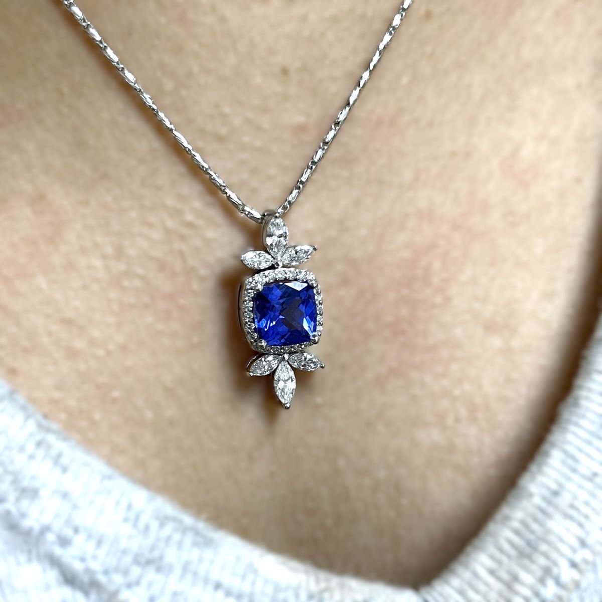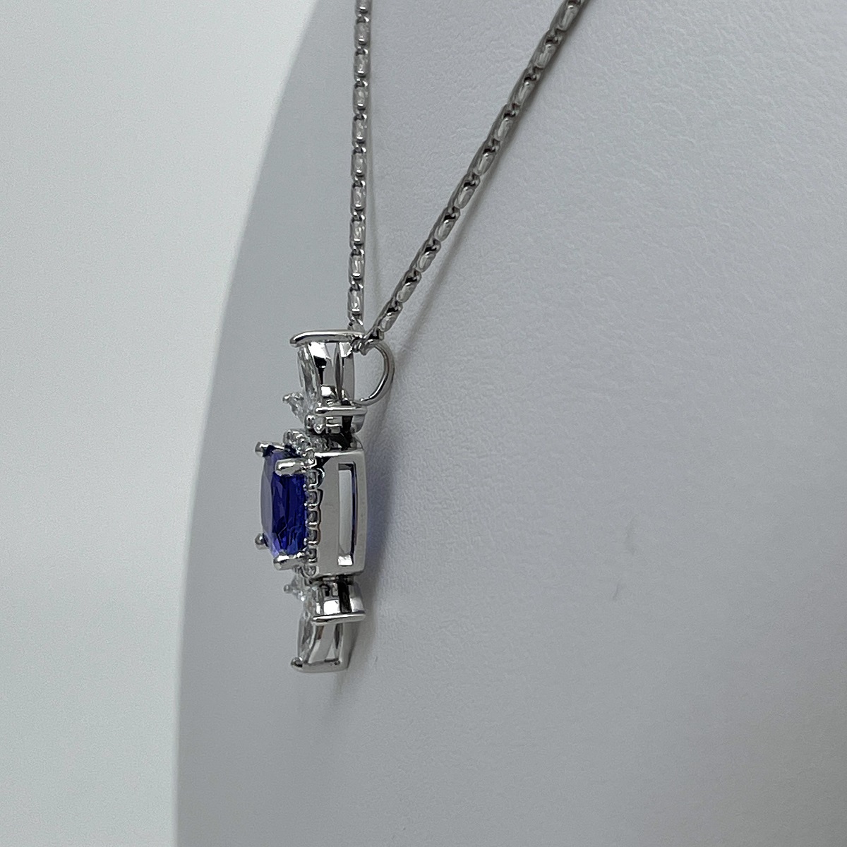 A vivid violet-blue tanzanite framed in brilliant diamonds, this pendant is a rare treasure of light and beauty