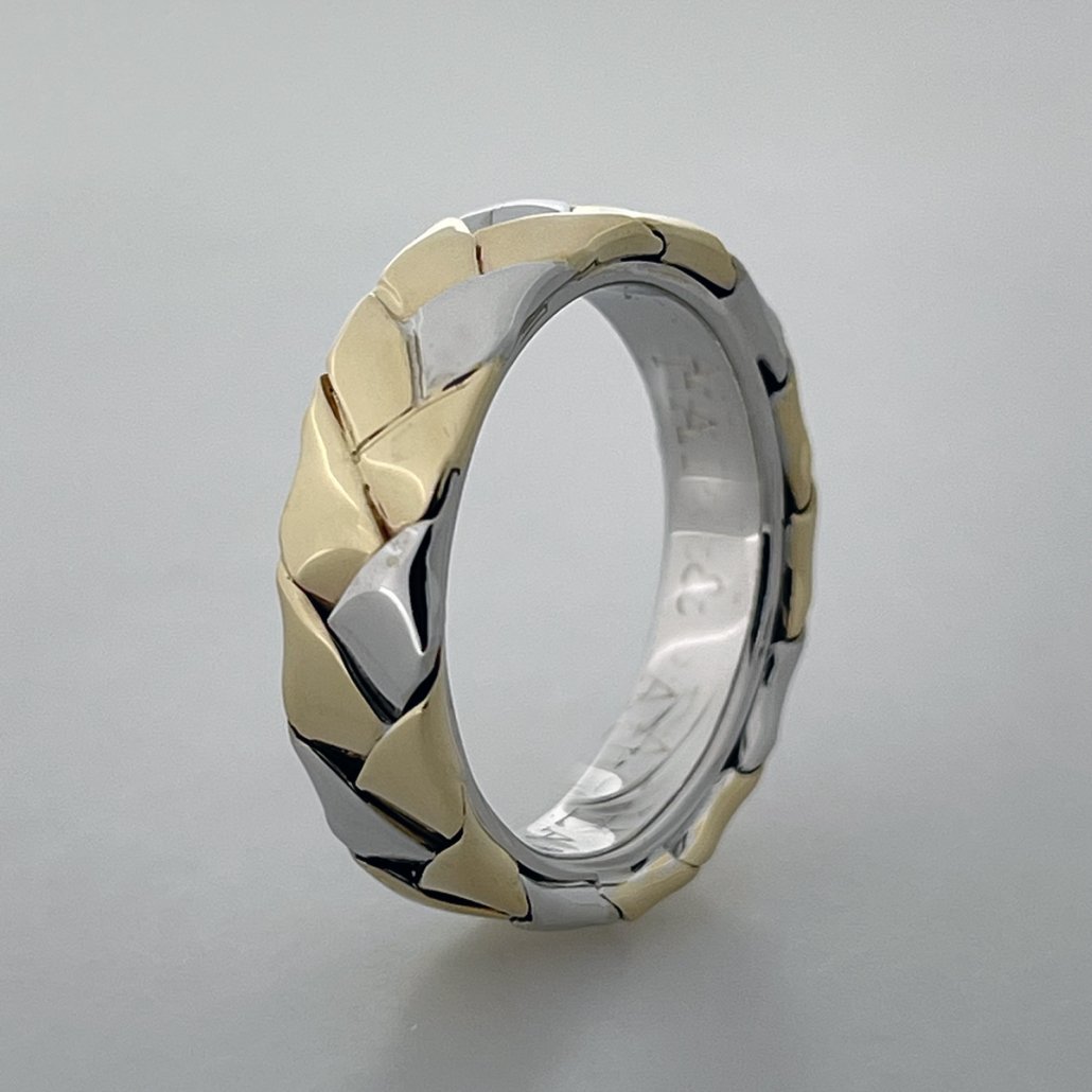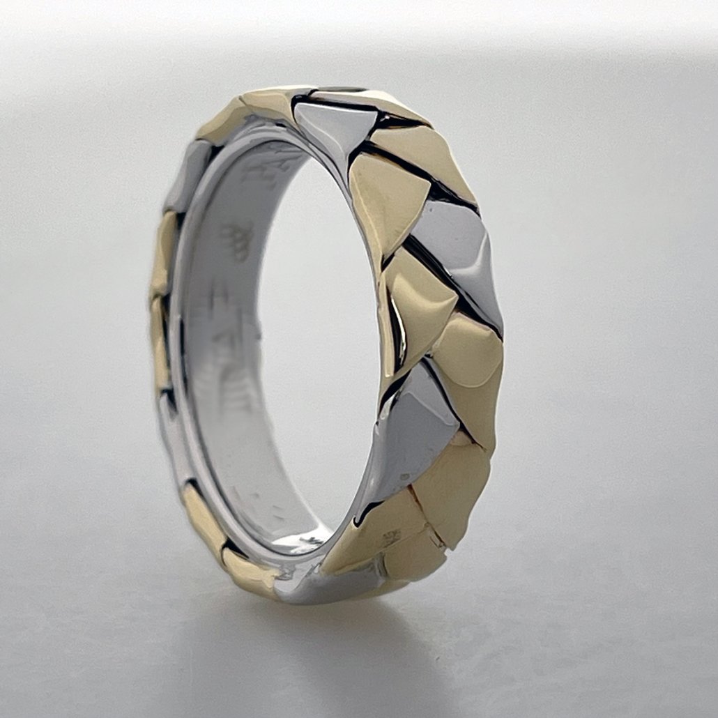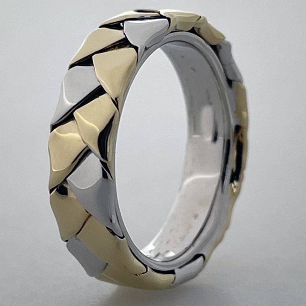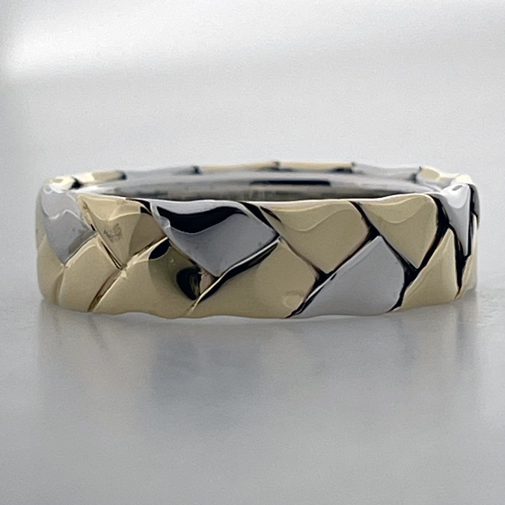This ring combines 14k white and yellow gold in a braided band.