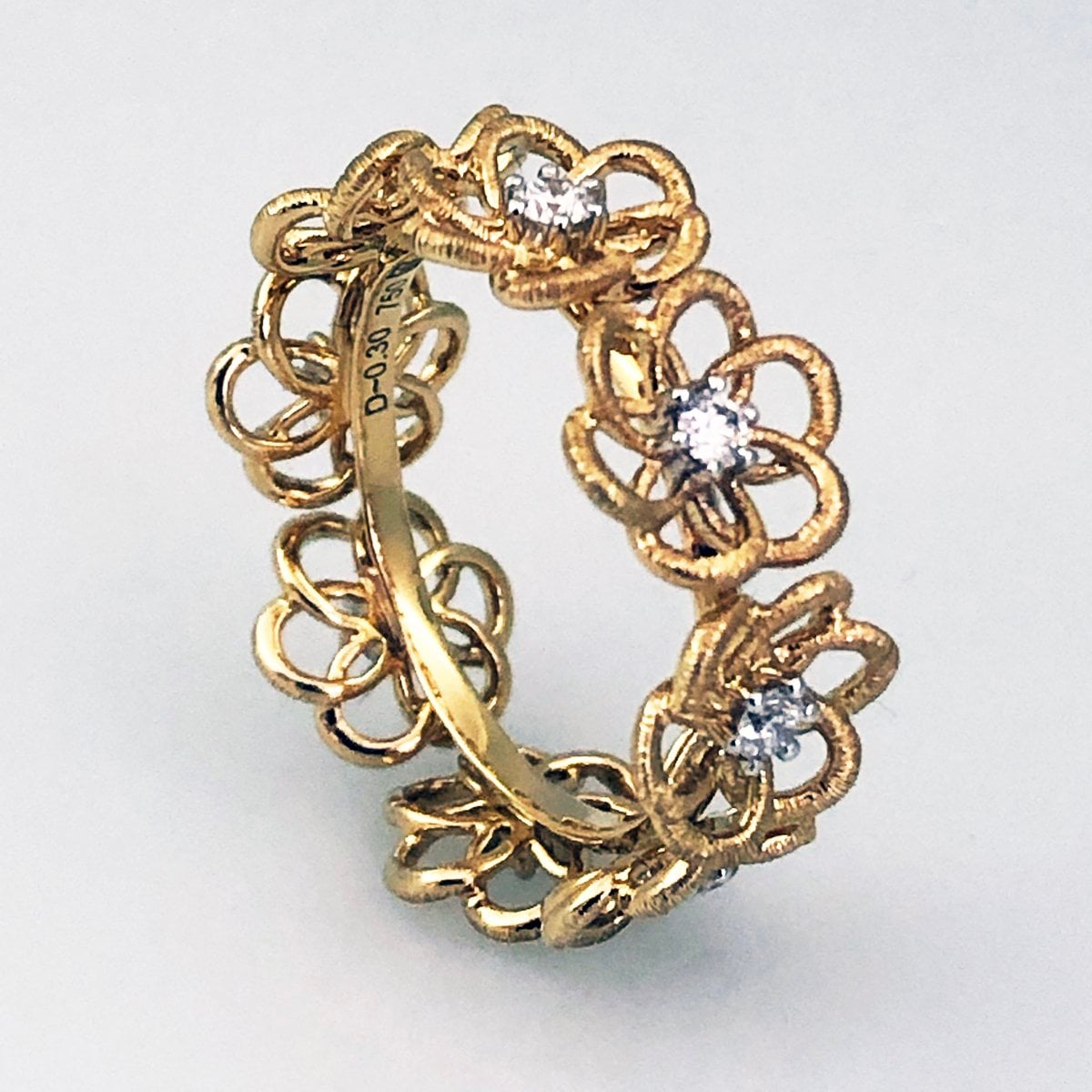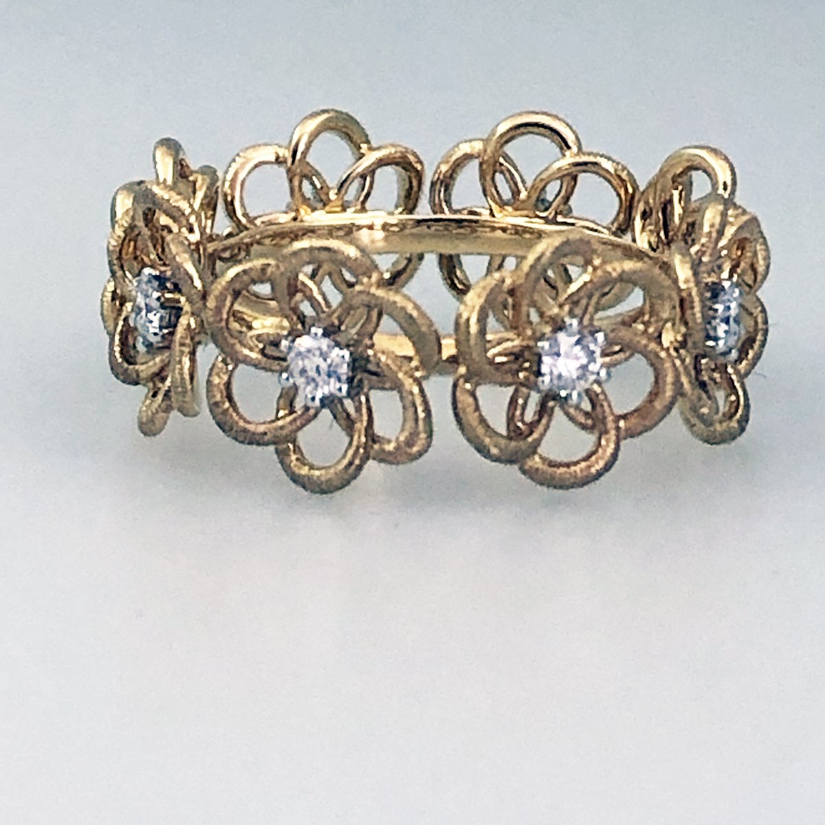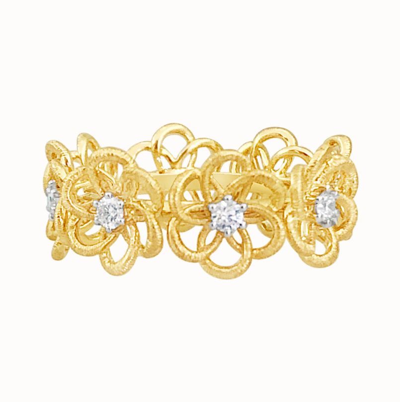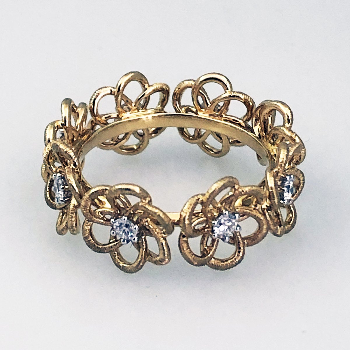 Eight flowers with diamond centers are made from gold loops. Vintage look and feel with warm yellow gold!