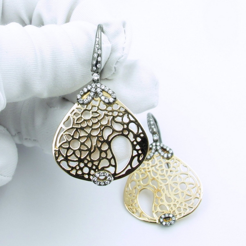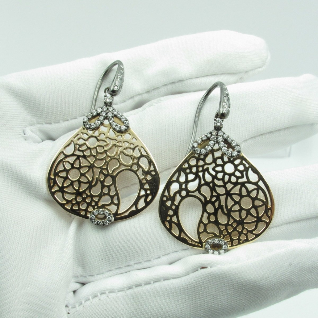 Pink Gold & Diamond Drop Earrings with delicate gold and floral filigree design.