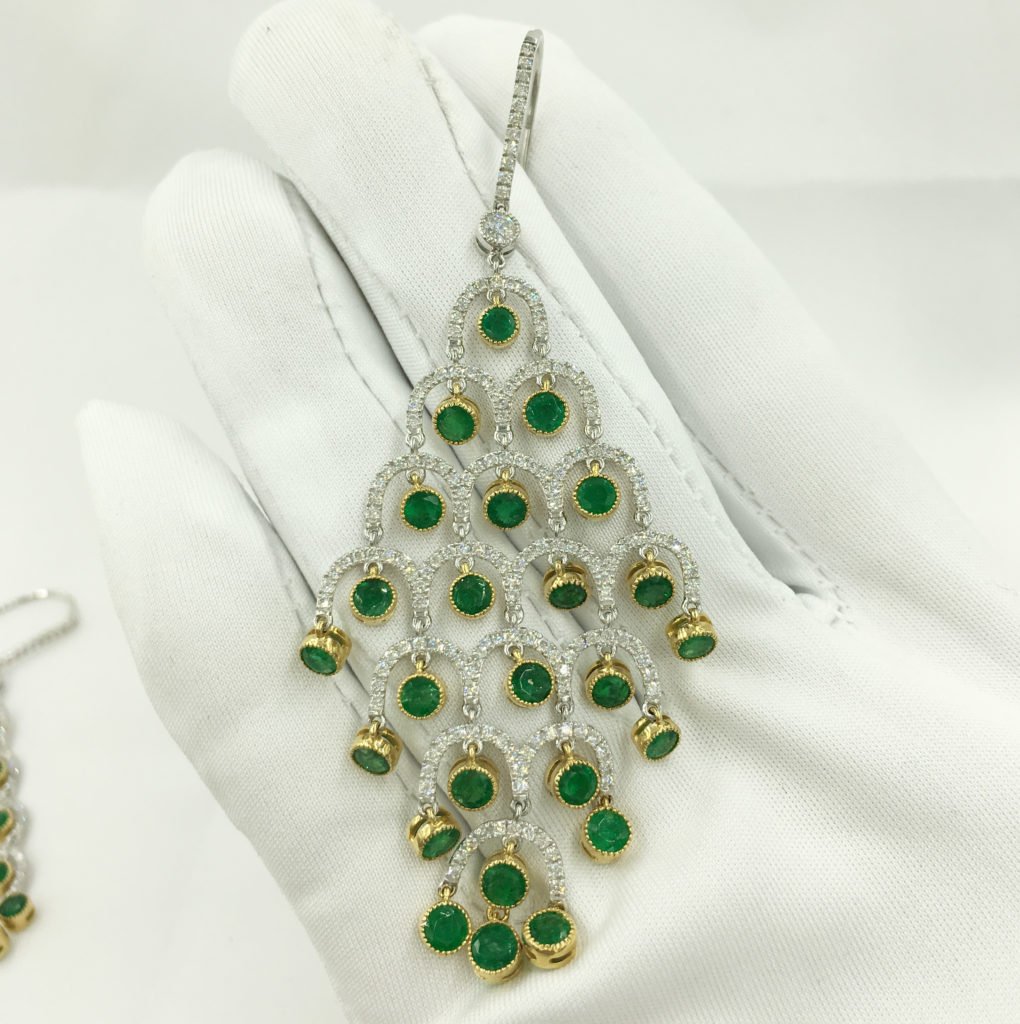 Platinum and yellow gold emerald and diamond chandelier earrings. The emeralds are natural rounds and have total weight of 7.19 carats. There are 3.83 carats of diamonds. The emeralds are dangling on links and there are diamonds pave set on the edges.