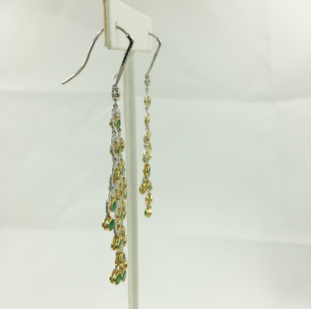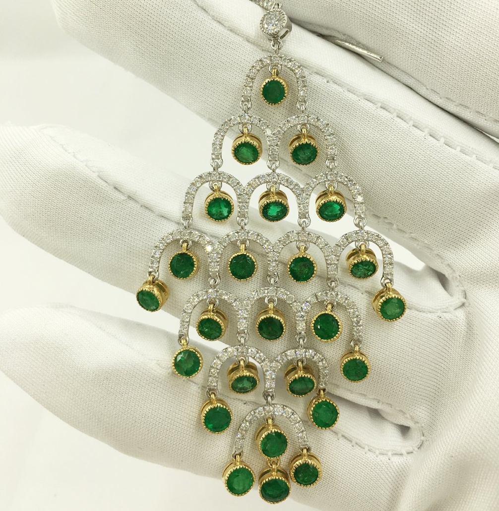 Platinum and yellow gold emerald and diamond chandelier earrings. The emeralds are natural rounds and have total weight of 7.19 carats. There are 3.83 carats of diamonds. The emeralds are dangling on links and there are diamonds pave set on the edges.