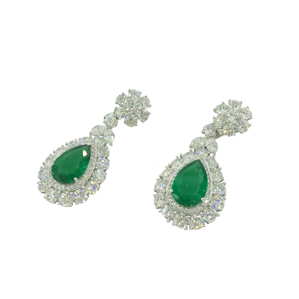 Majestic emeralds dangle from clustered diamonds in these stately earrings.